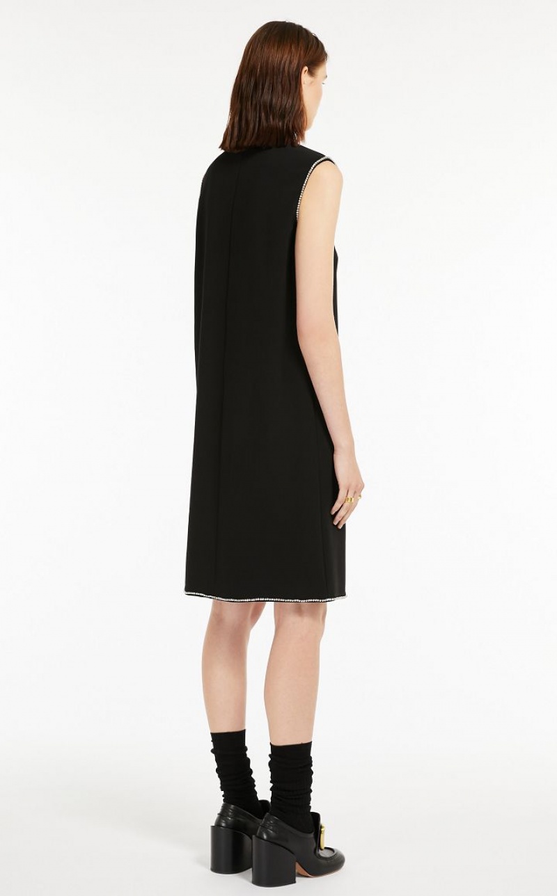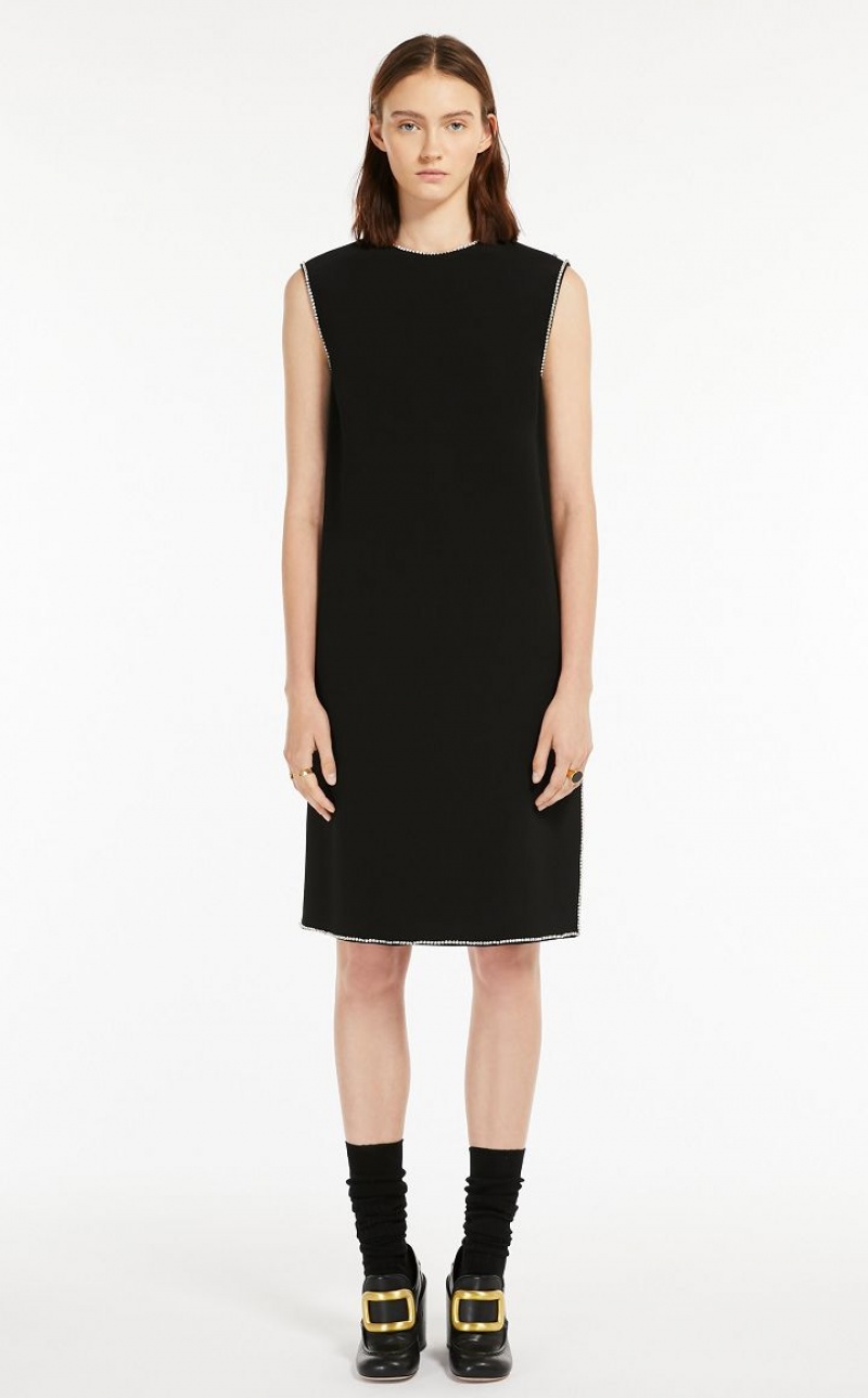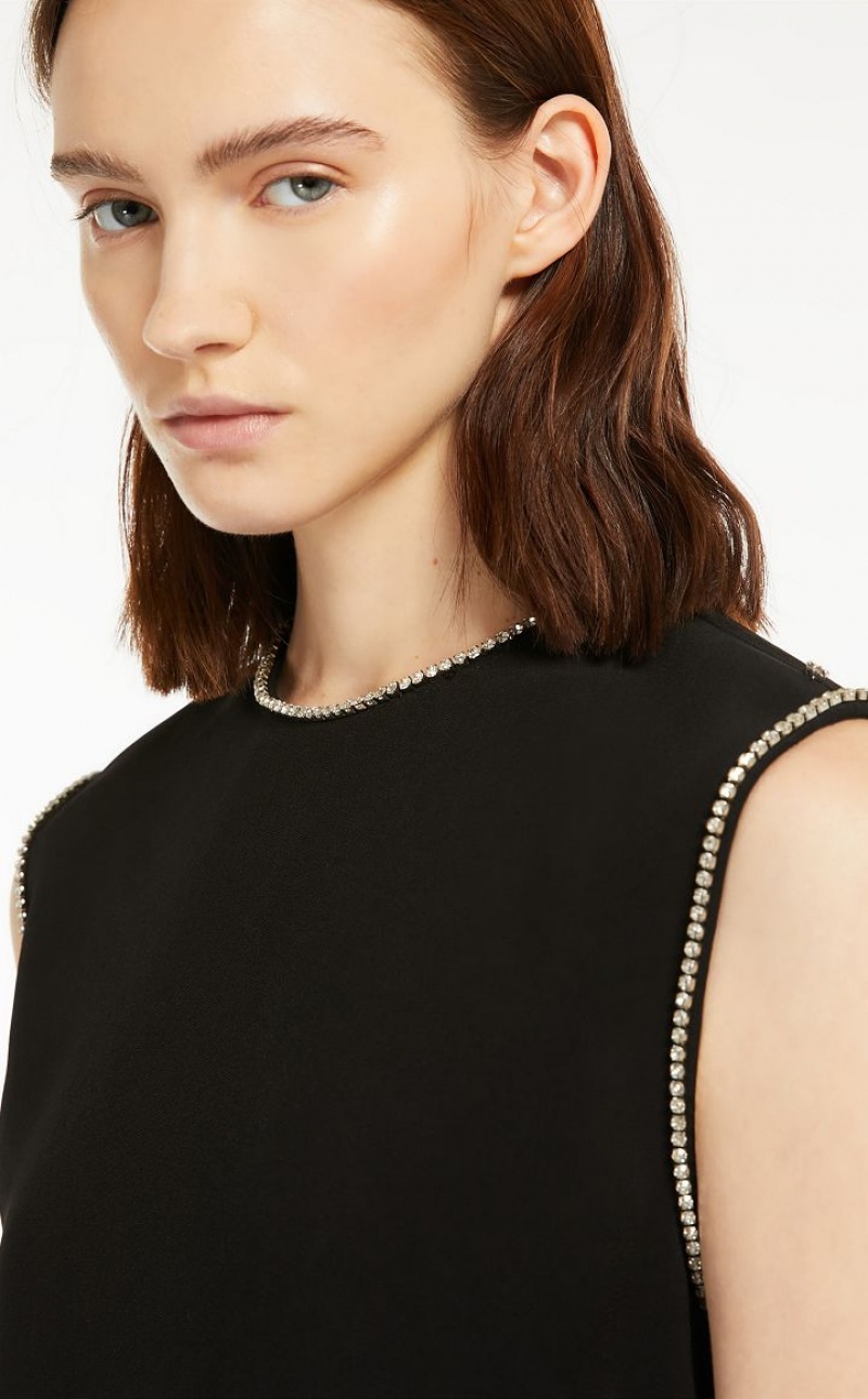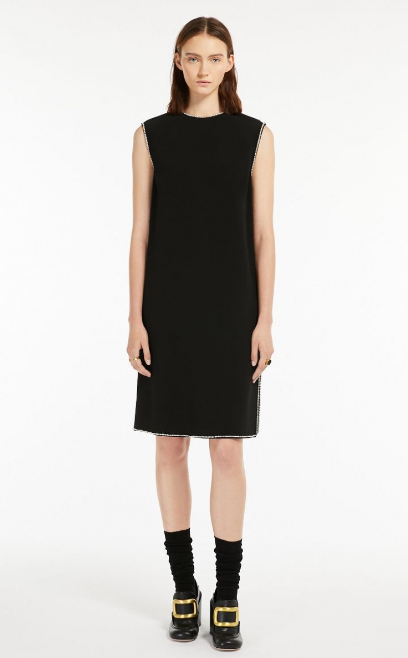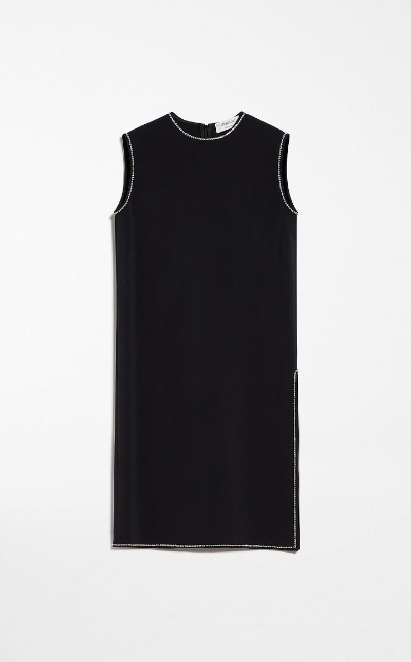 Dress in stretch viscose cady, with a fluid, flowing feel, embellished with rhinestones applied along the neckline, armholes, hem and slit. Straight fit with deep oblique darts under the bust and a vertical seam in the centre-back line. The deep side slit on the left adds a sensual touch. Length: 100 cm.