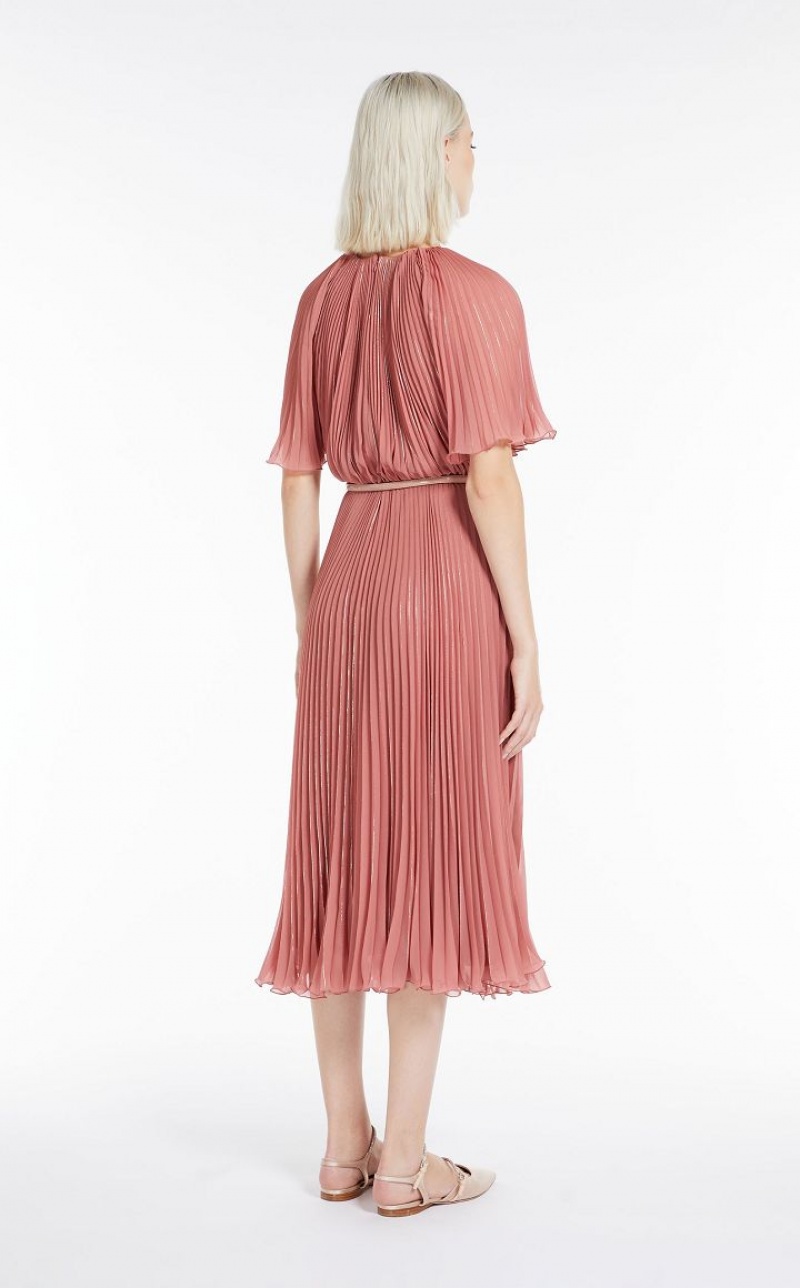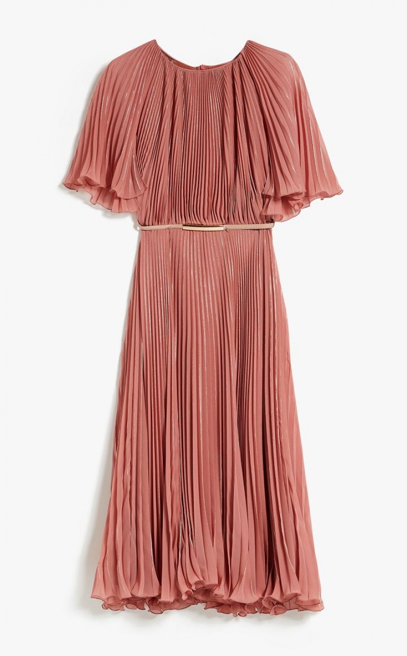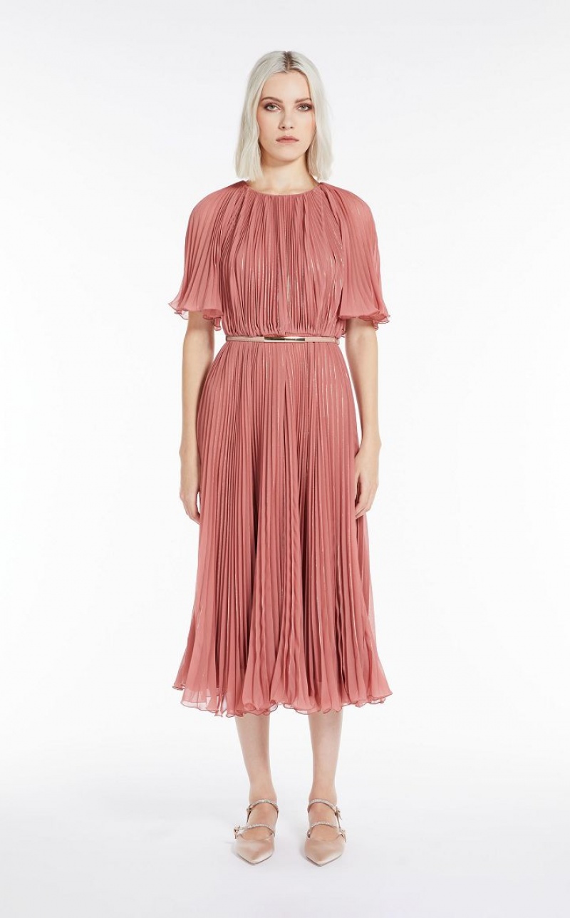 Long dress in fine sable georgette fabric featuring a crew neckline and butterfly sleeves. The dress boasts refined movement-creating sunray-pleated detail. Silhouette-accentuating thin patent leather belt. Lined model. Length: 120 cm.