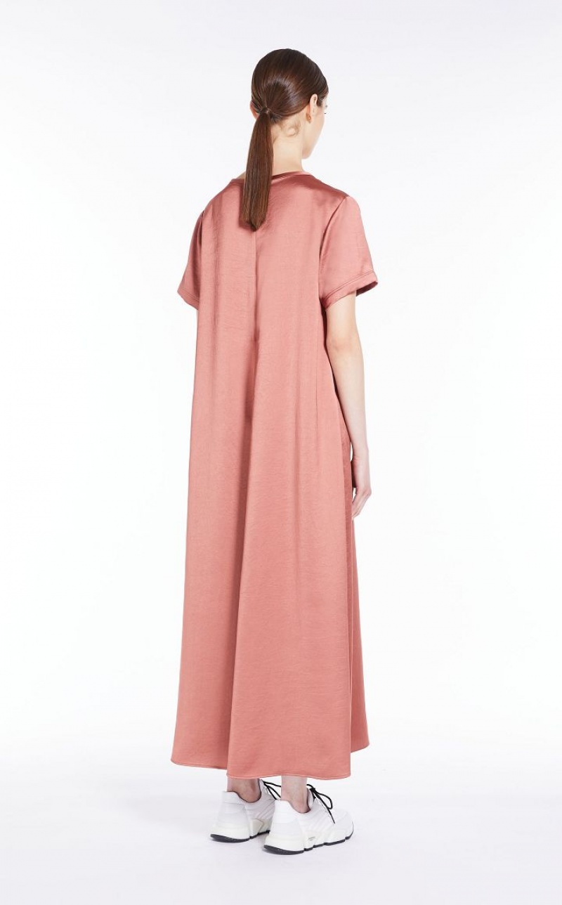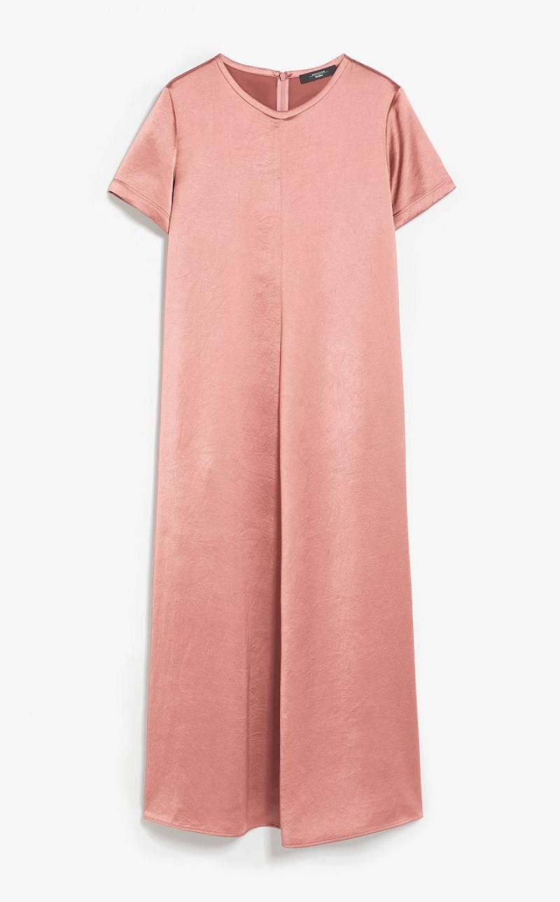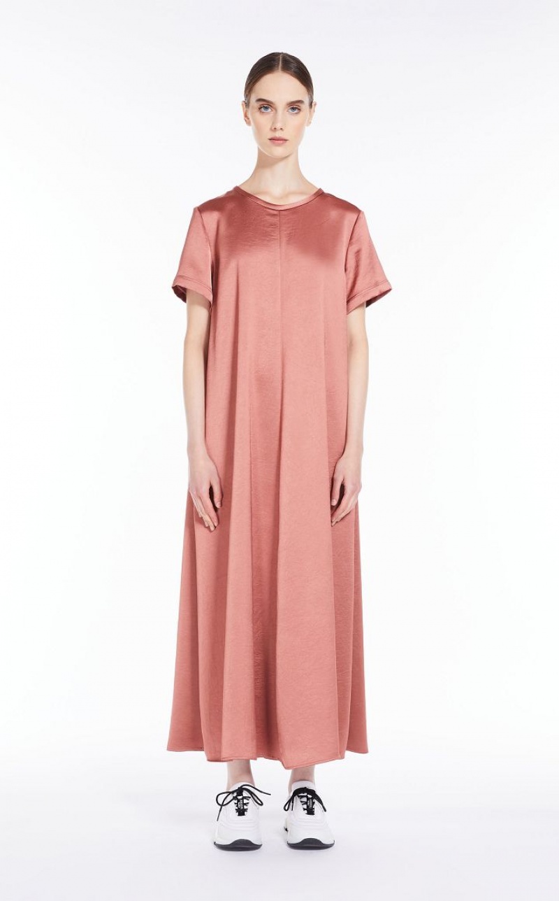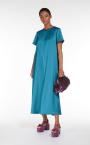 Long T-shirt style dress in fluid, semi-glossy satin fabric. This style is straight cut with a relaxed fit, with round neck and short set-in sleeves. Fastening with small concealed zip on the back. Length: 130 cm