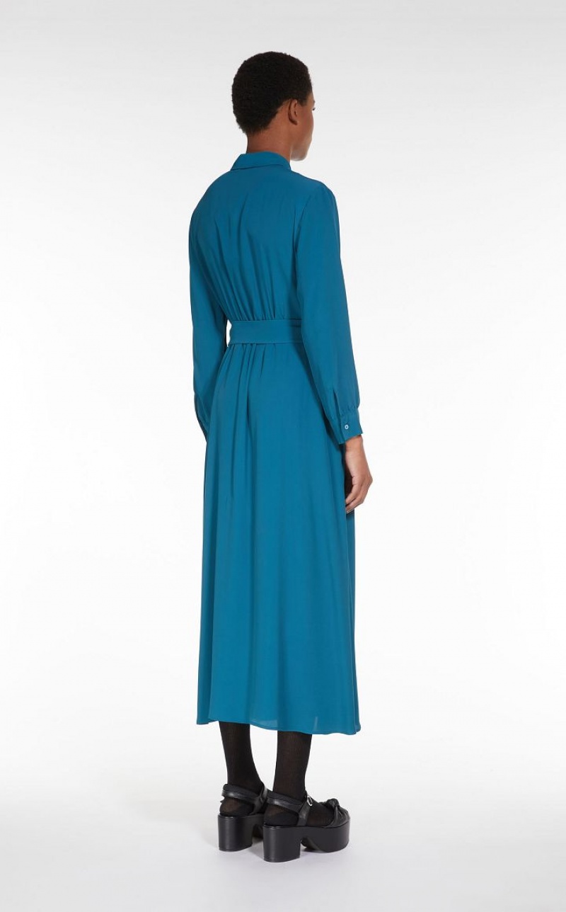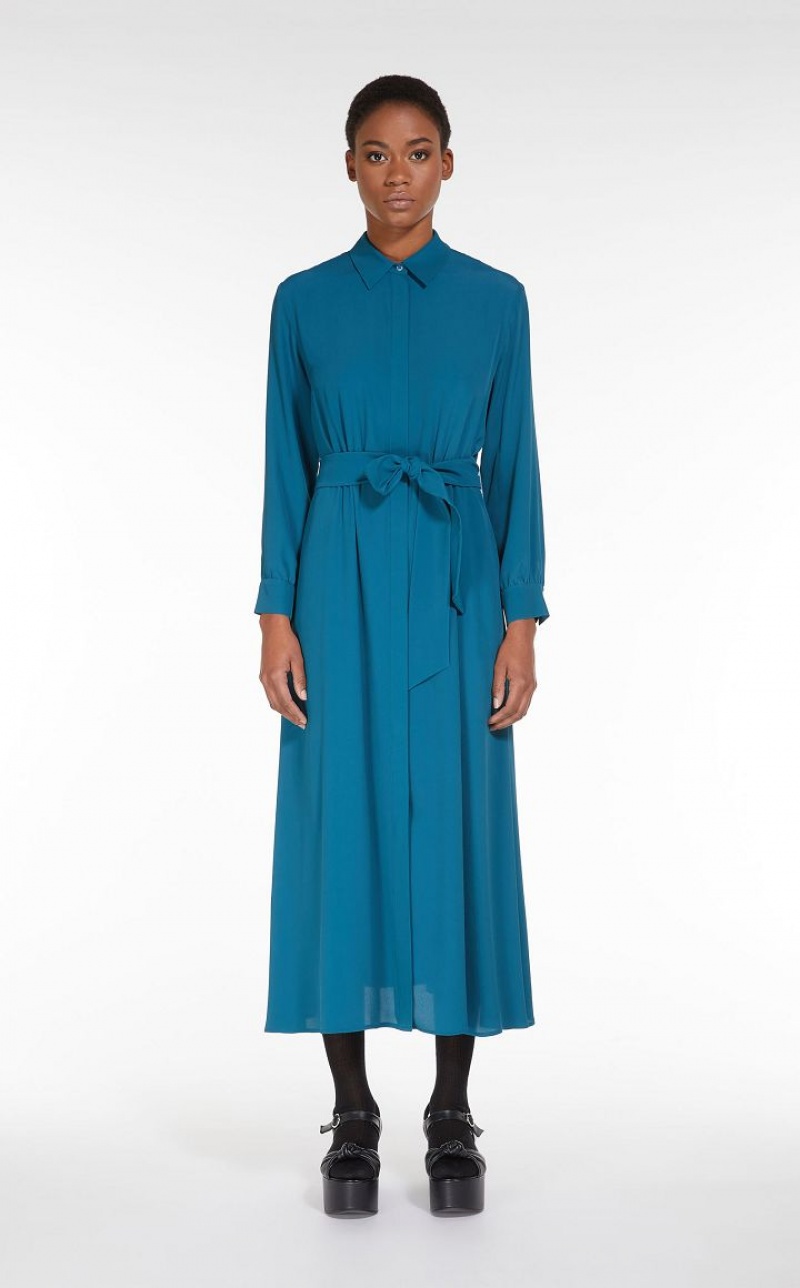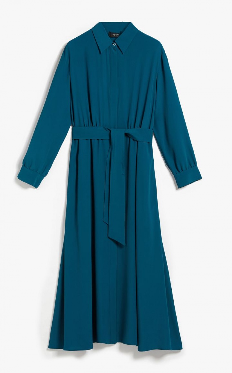 Long shirt dress in luxe silk blend crepe de chine. With a fit & flare silhouette featuring a loose, flared skirt, shirt collar, pockets set into the side seams and long sleeves with cuffs. Unlined style featuring a seam at the waist with subtle gathering at the front and back, and matching belt to accentuate the waistline. Length: 130 cm.