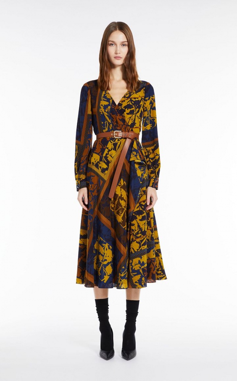 Long dress in fine pure silk crepe de chine fabric featuring a crossover V-neckline and long cuffed sleeves. The fluid-fit model boasts a feminine silhouette-enveloping unstructured handkerchief skirt, in addition to a waistline-accentuating matching leather belt. Lined model. Length: 122 cm.
