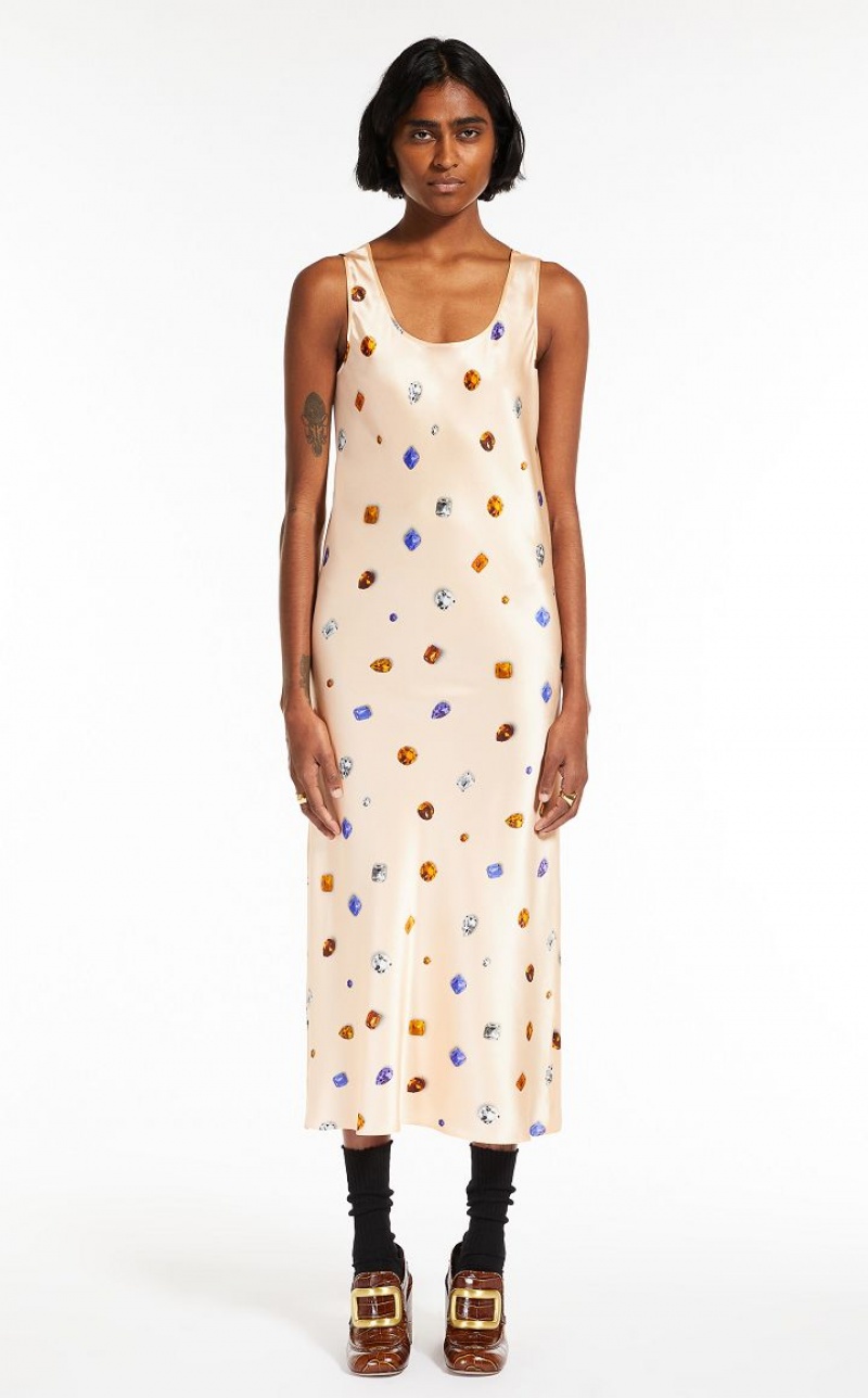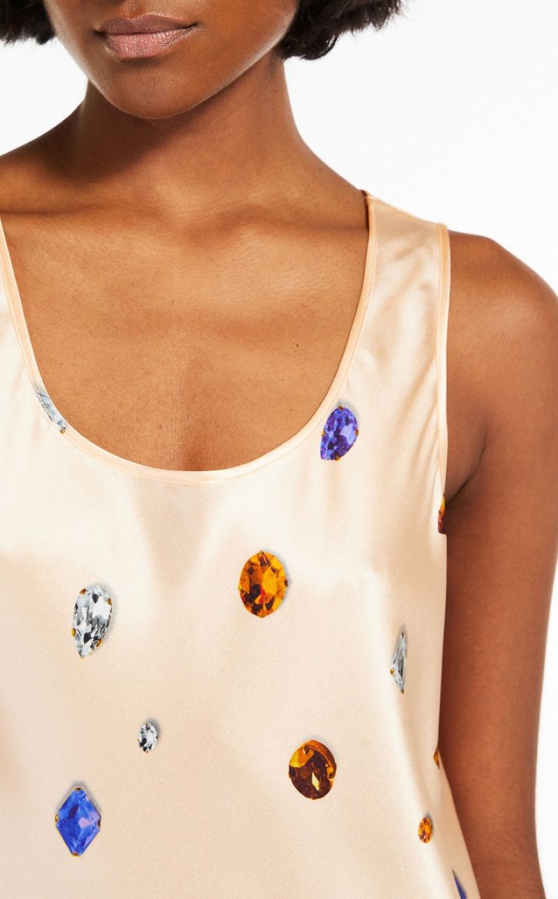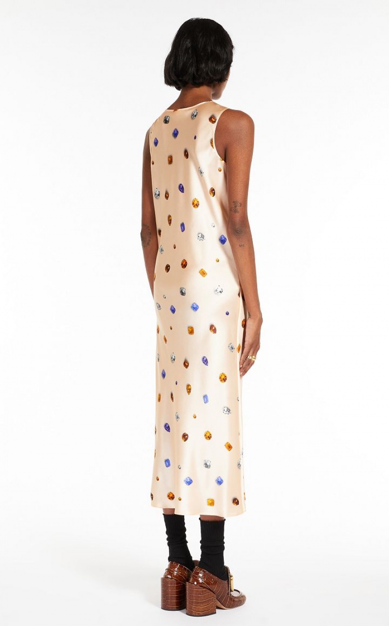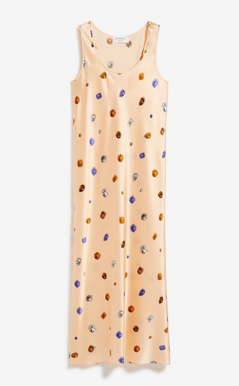 Sleeveless dress made of stretch silk satin decorated with a gemstone print. Flared, with a scoop neckline on the front and a feminine, fishtail construction. The armhole and neckline are trimmed with matching-tone piping.