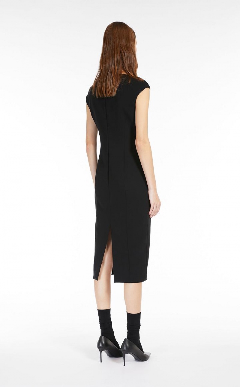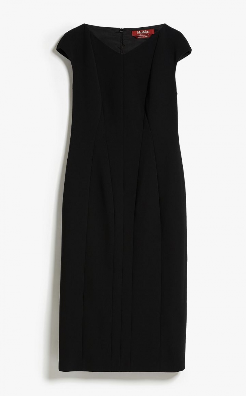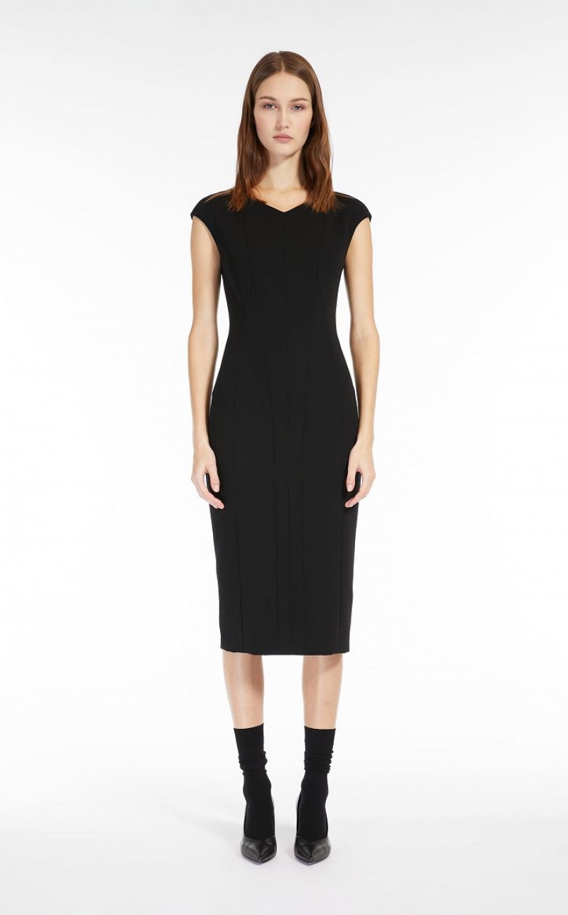 Long V-neck dress in refined technical cady fabric featuring slight kimono-style sleeves, in addition to slim silhouette-accentuating vertical dart detail. Lined model. Length: 115 cm.