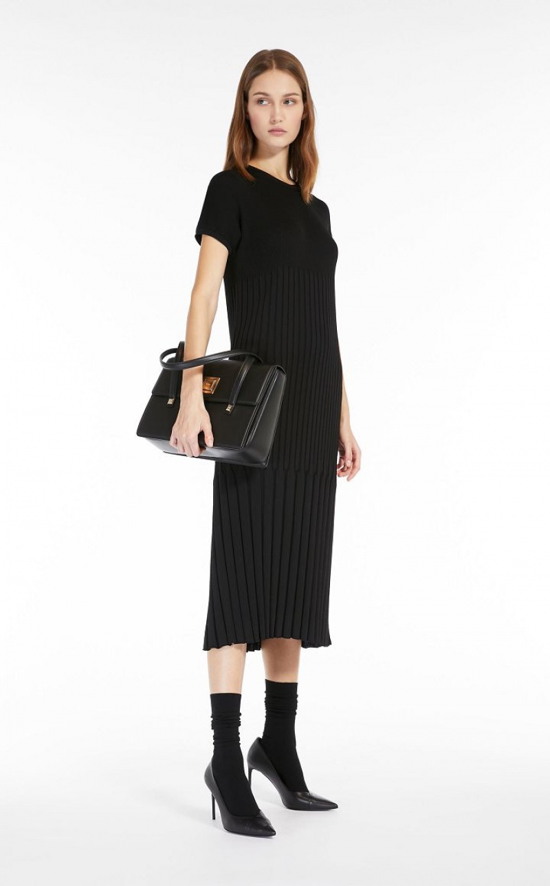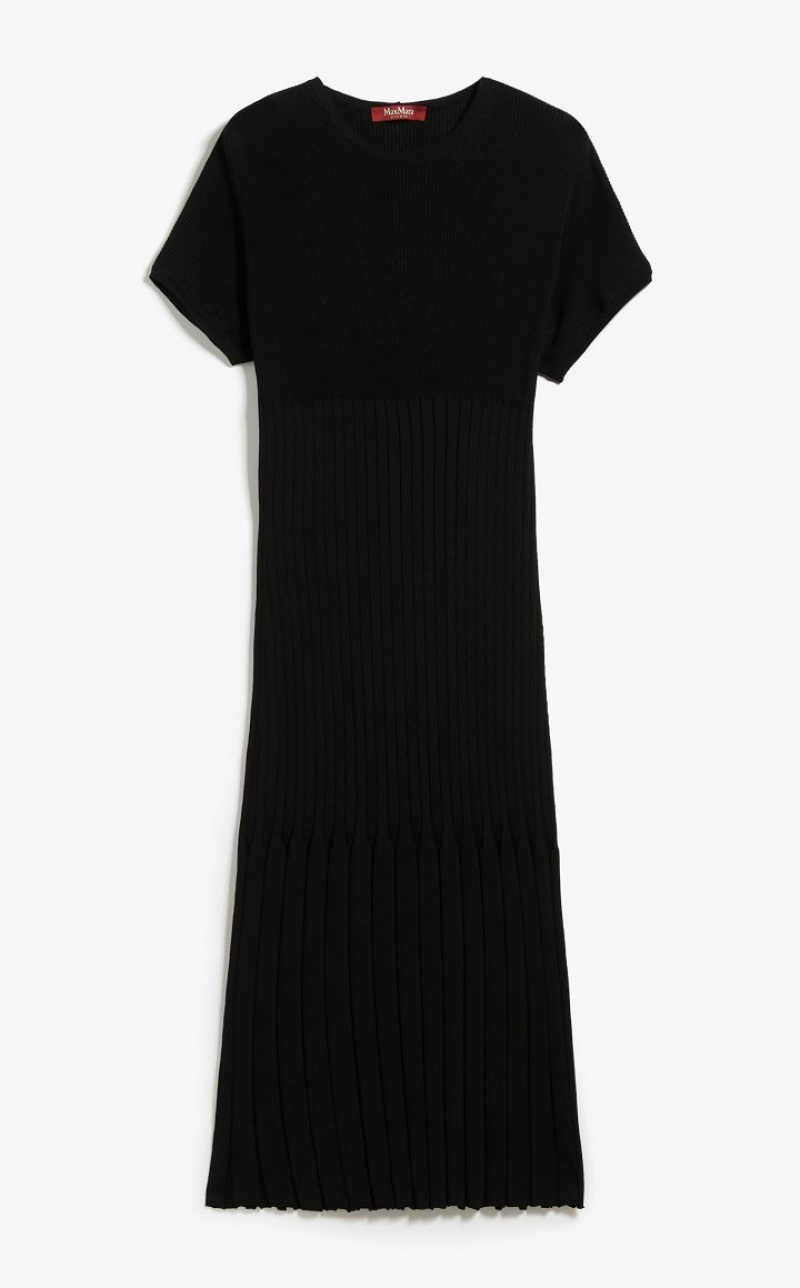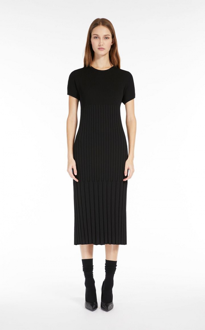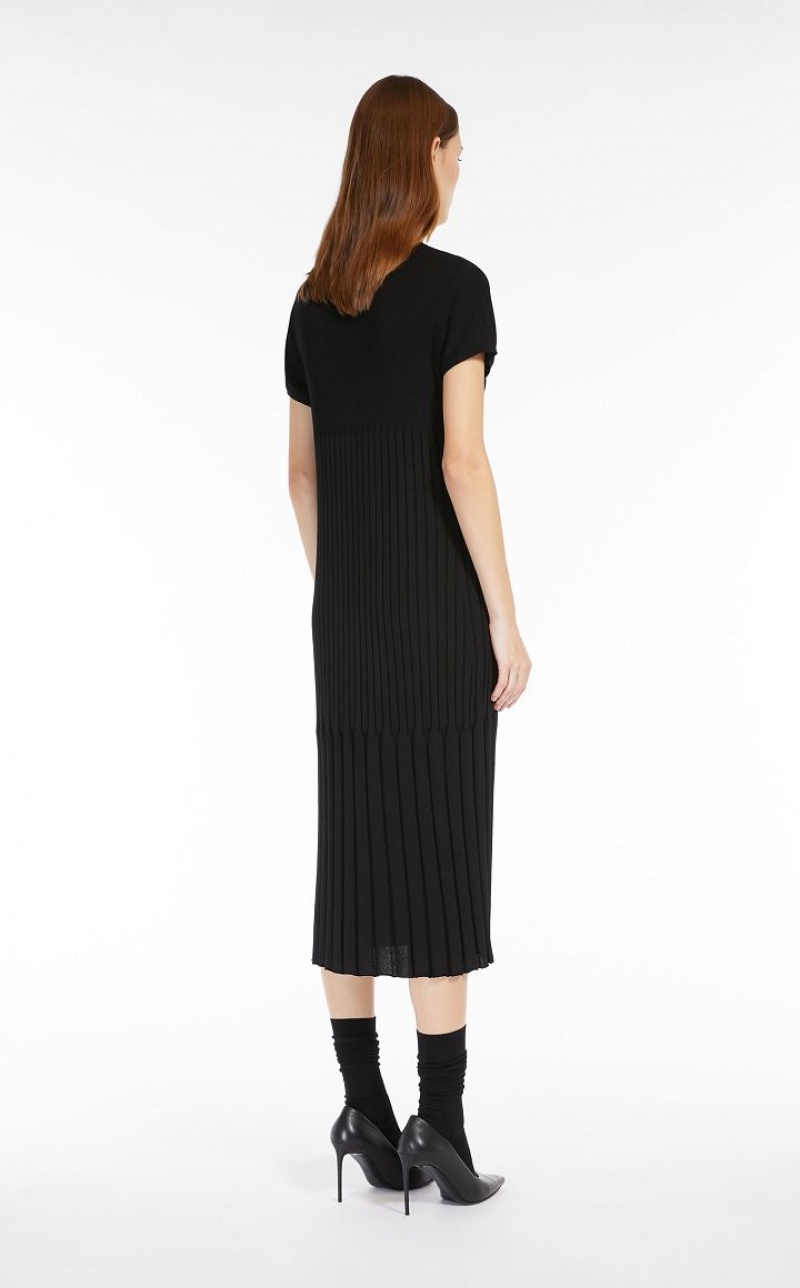 Short-sleeved crew-neck midi dress in soft stretch viscose fabric featuring a refined rib-knit pattern. The different rib thickness enhances the silhouette-enveloping and defining slim fit. Length: 118 cm.