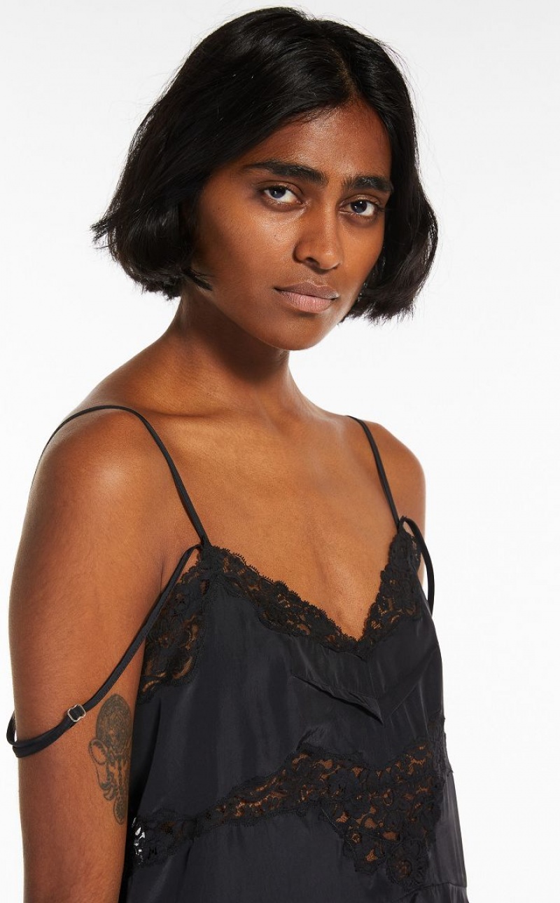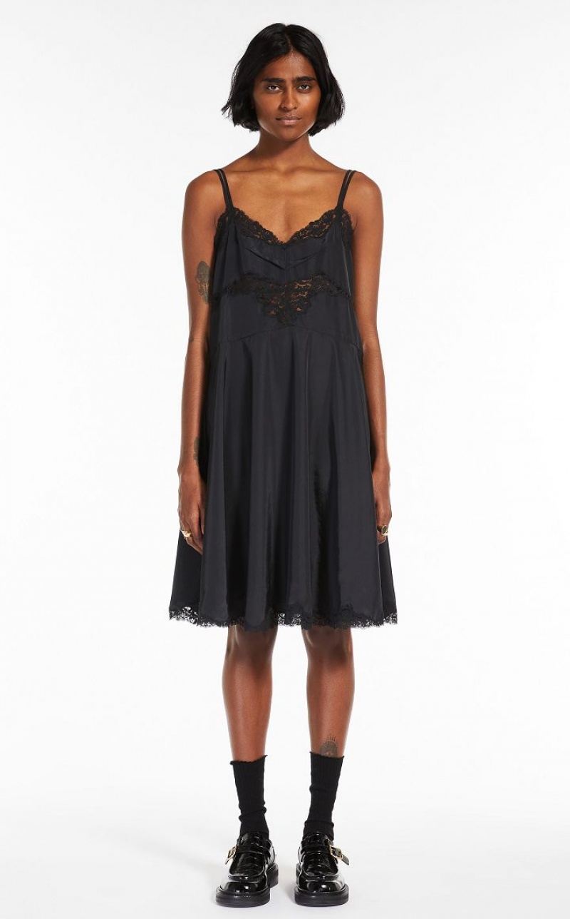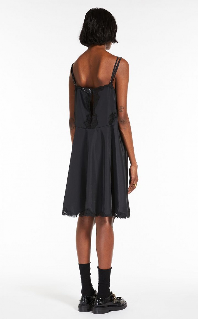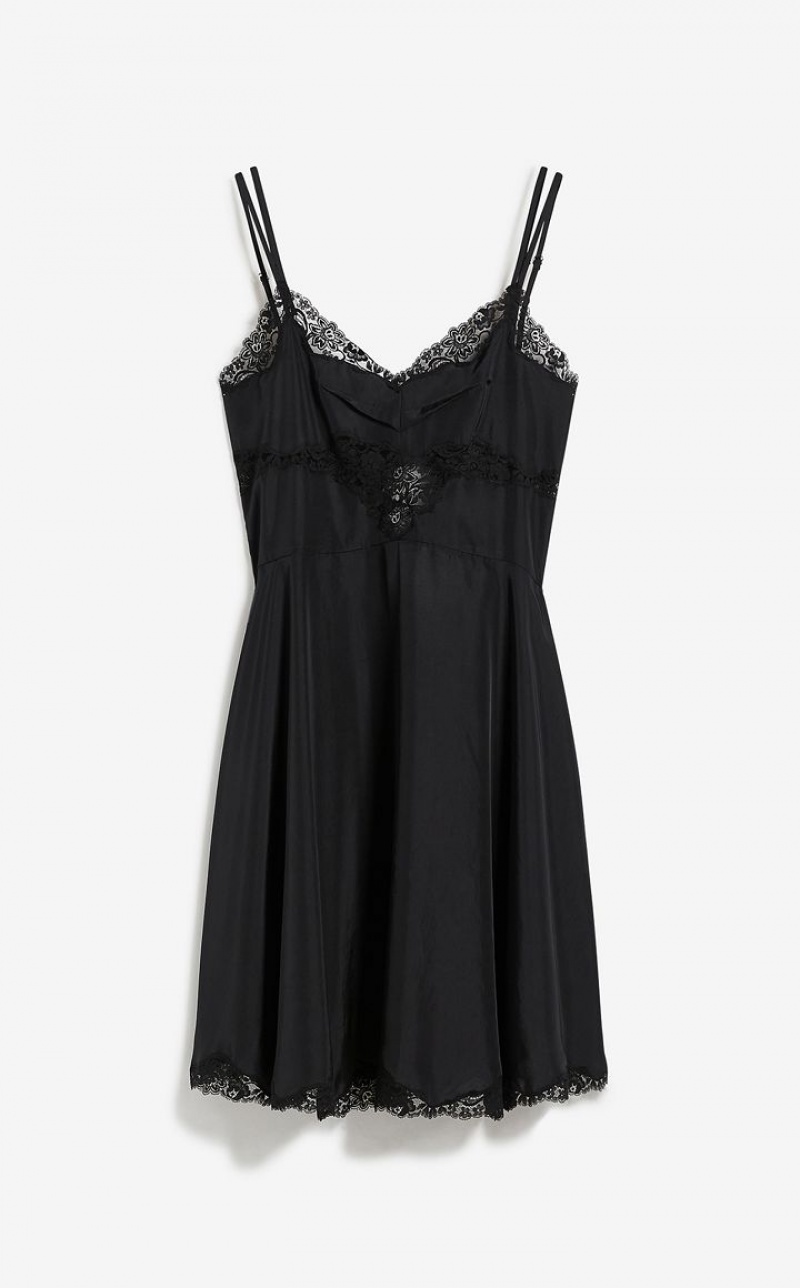 Lingerie-style dress, made of washed technical plain-woven fabric, decorated with lace inlays along the neckline, on the bodice, back and hem. The teardrop opening on the back features a large cut-away held together by a small button. Slim, double shoulder strap with adjuster and flared skirt. Knee-length.
