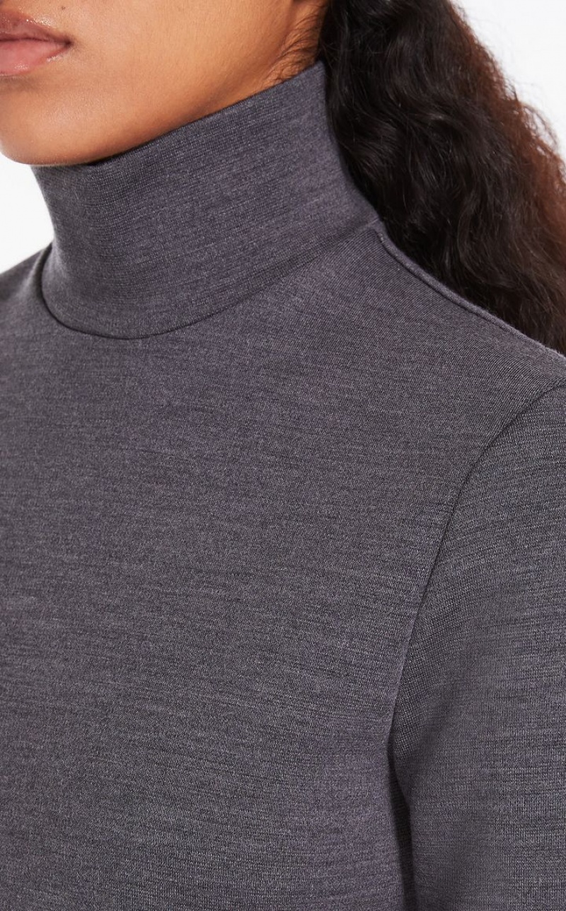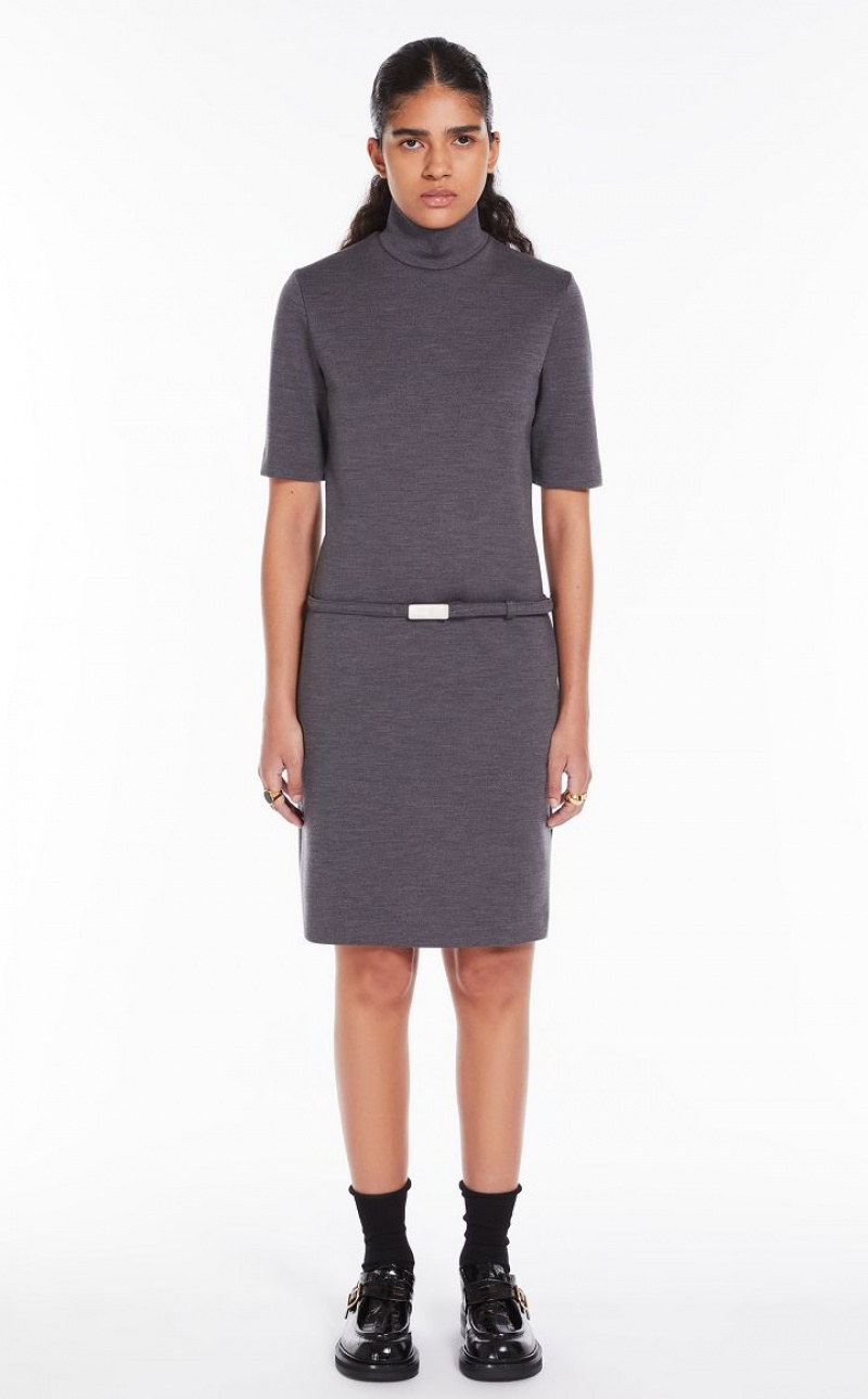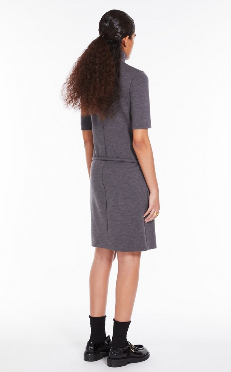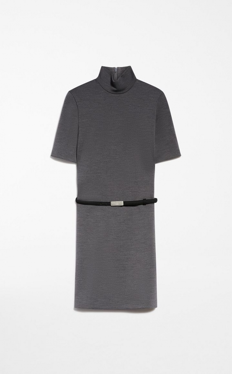 Dress made of stretch wool jersey in Milan stitch. The line is feminine yet soft, with a polo neck and short sleeves. The garment is completed by a belt covered in the same fabric, to be worn on the hips. Concealed back opening with zip.