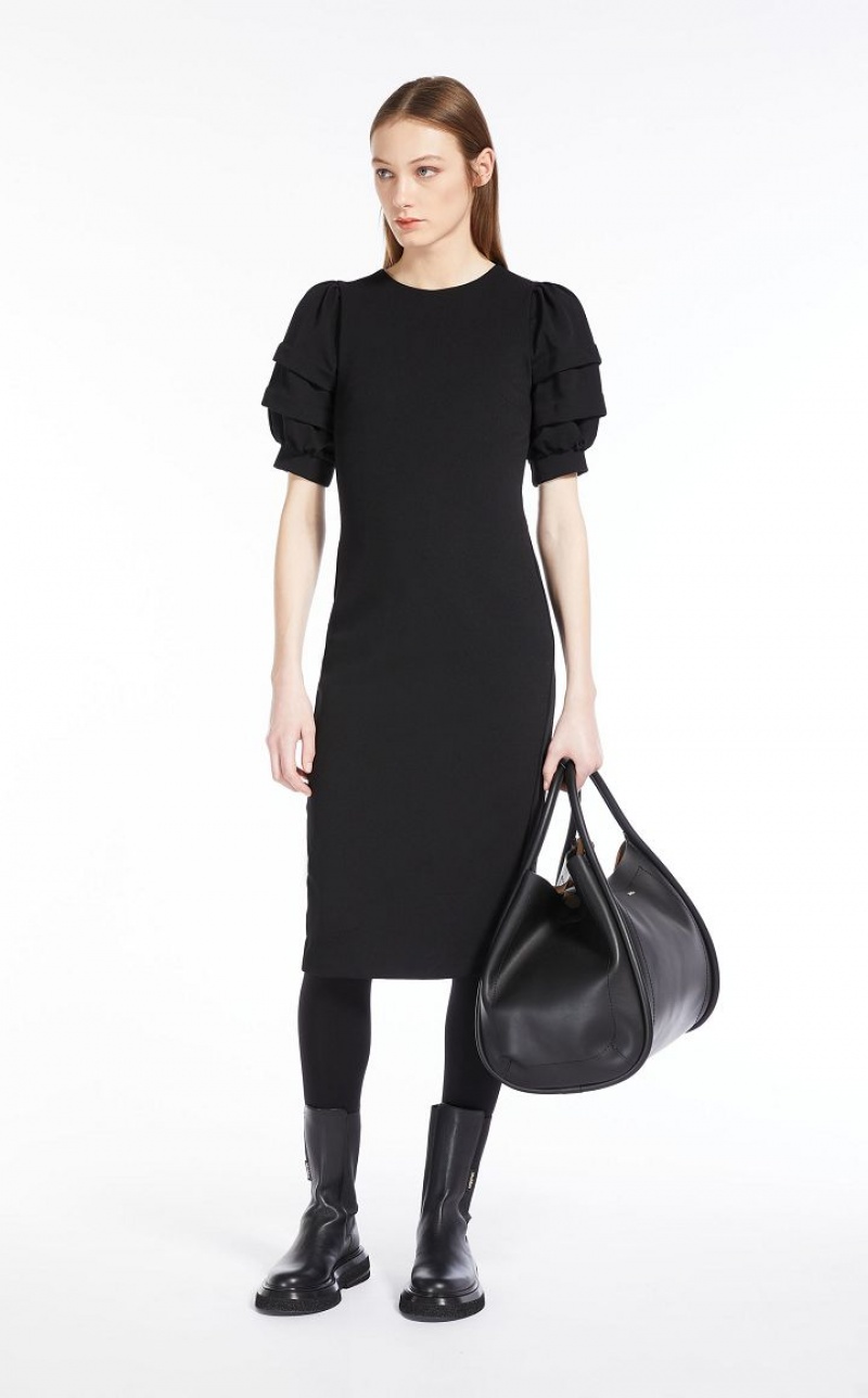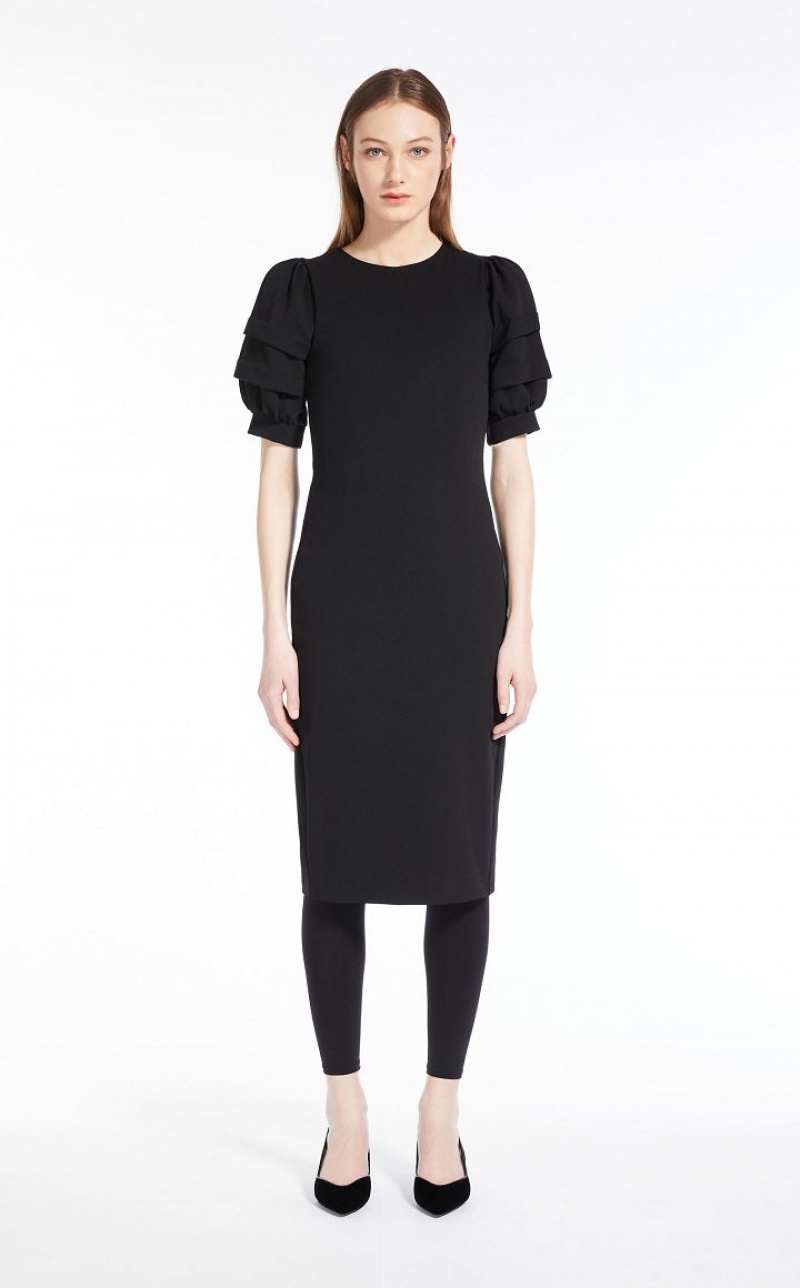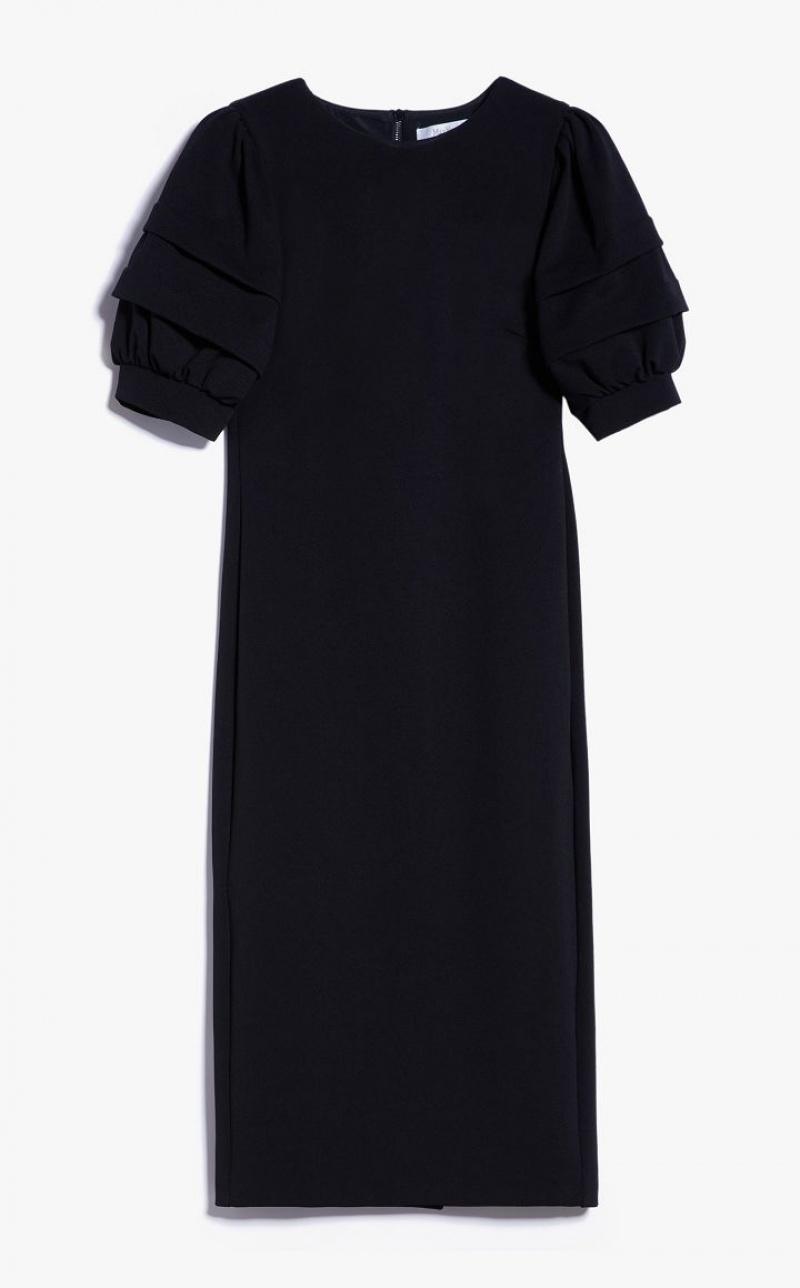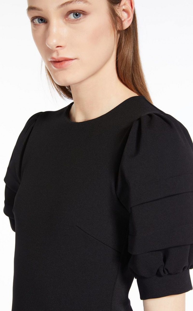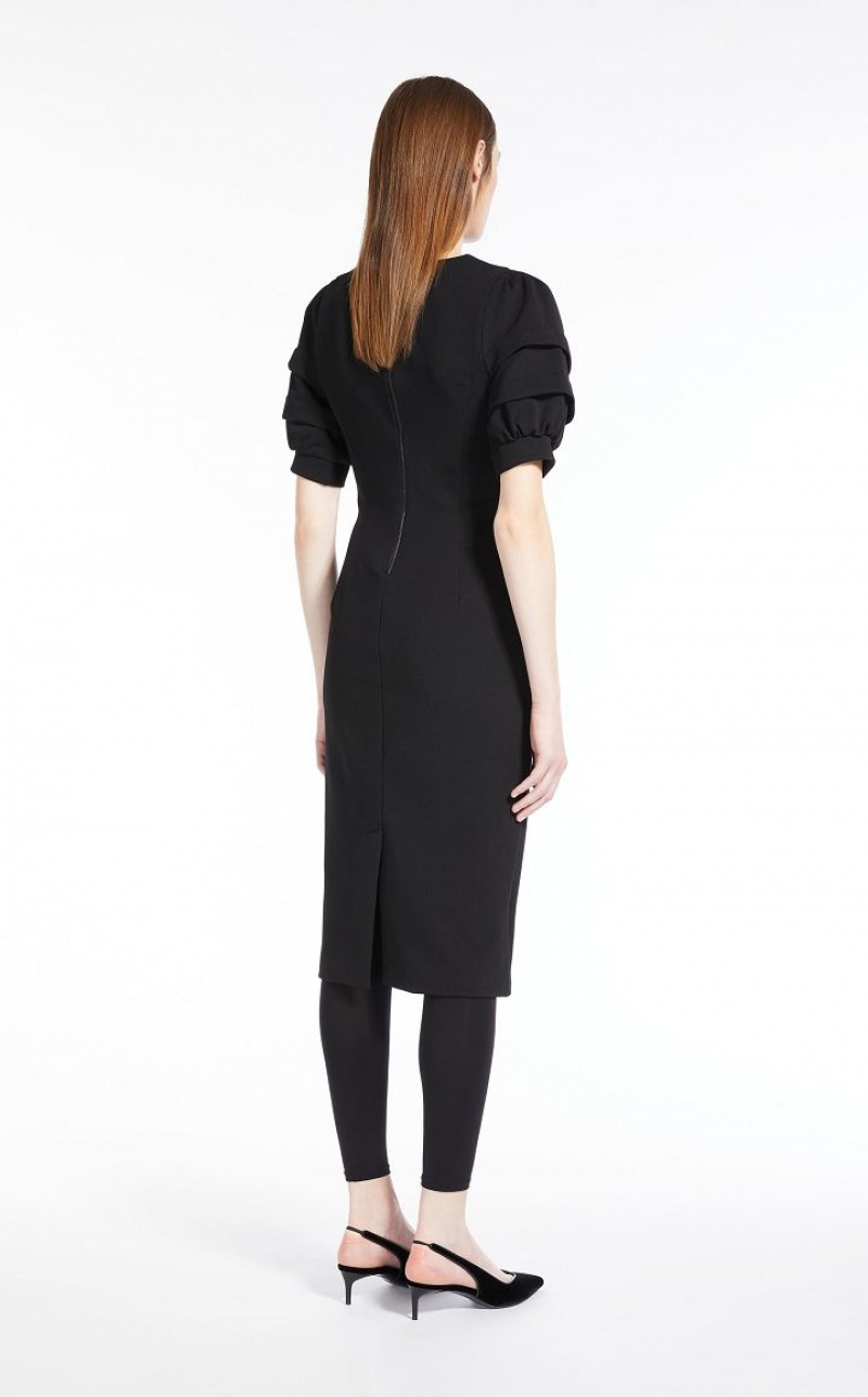 Sheath dress in stretch jersey, characterised by a loose twill texture and a pleasant technical feel. Style featuring a fitted, feminine silhouette, with round neckline and short puff sleeves with double stitched pleat and cuff. Lined in stretch fabric and finished with central slit on the back. Back zip fastening. Length: 110 cm.