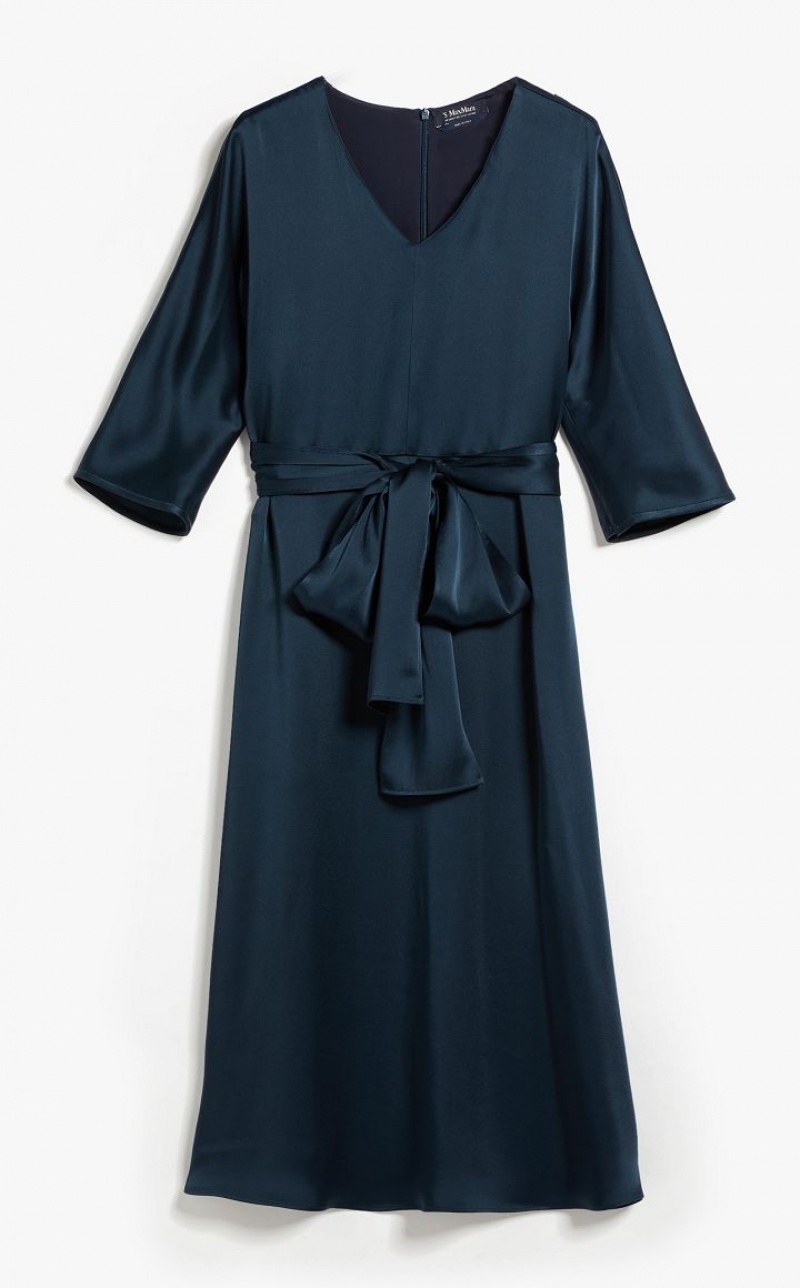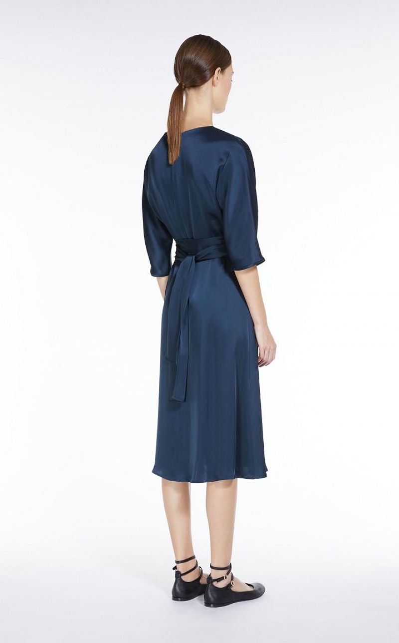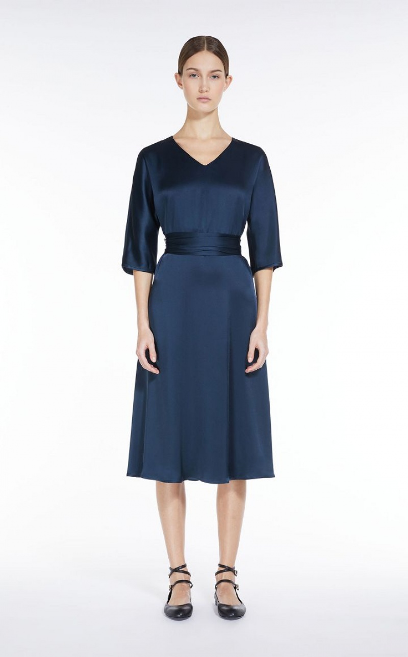 Long dress in double-faced viscose-blend satin fabric featuring a V-neckline and short kimono sleeves. The silhouette is defined by the delicate bias-cut skirt and waistline-accentuating matching sash. Length: 116 cm.