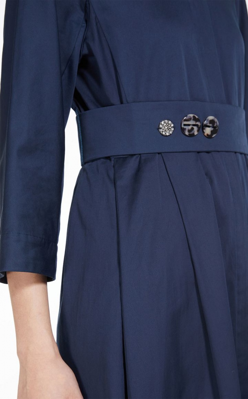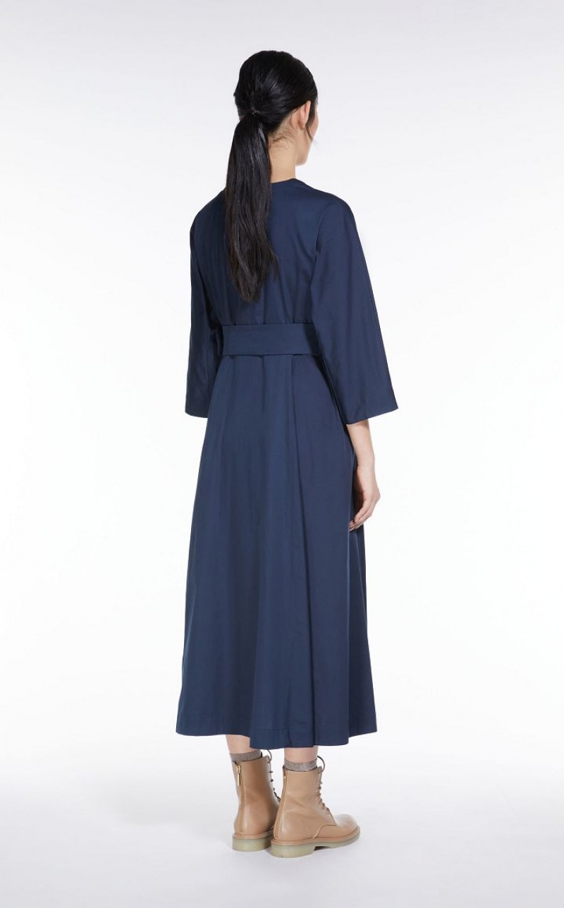 Comfort-fit long dress in fine washed cotton satin fabric featuring a front fastening, V-neckline and kimono sleeves. Feminine silhouette-accentuating matching resin-embroidered belt. Length: 124 cm.