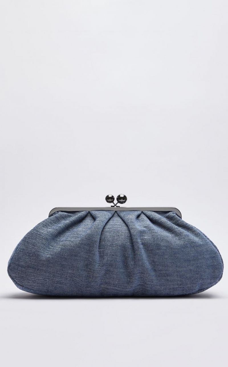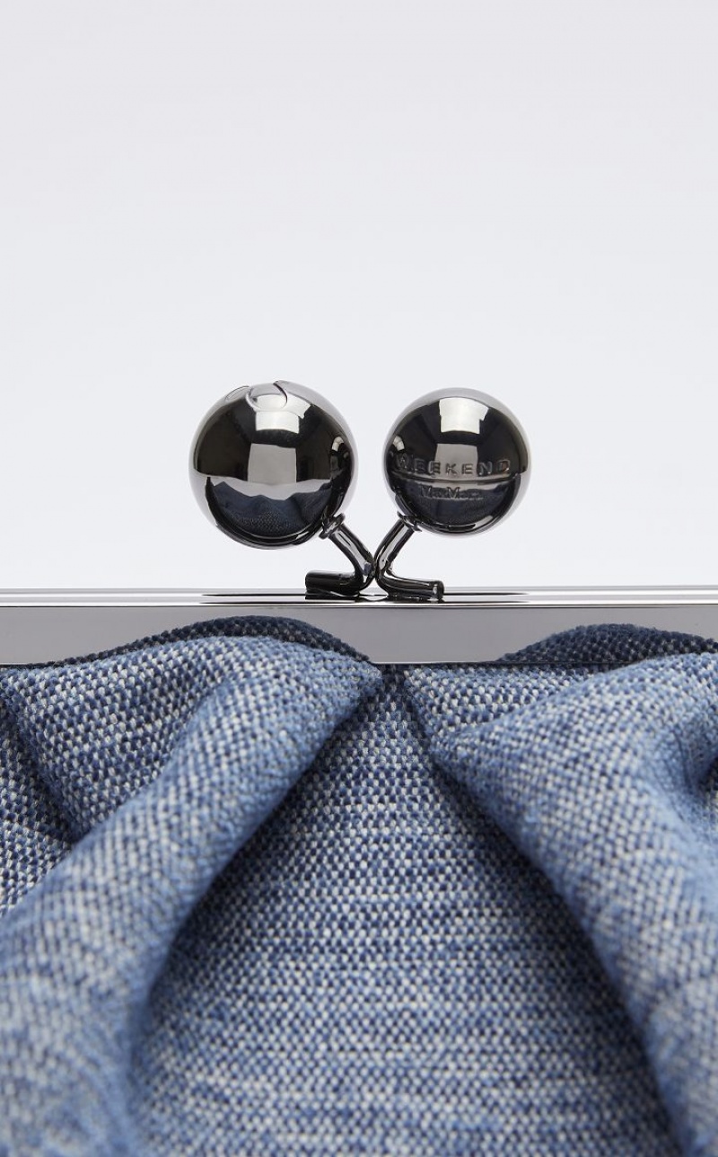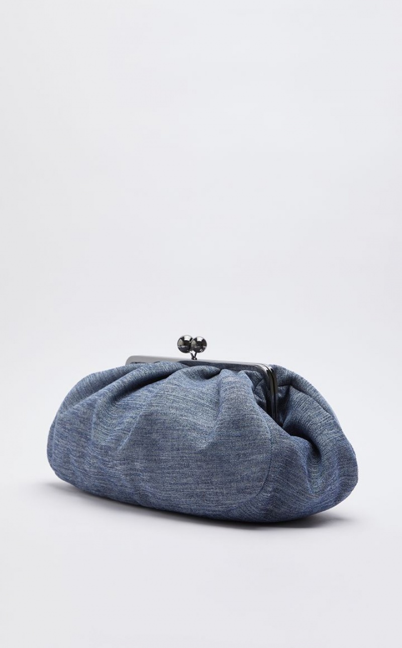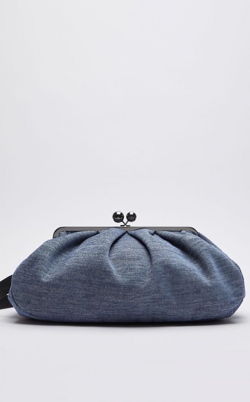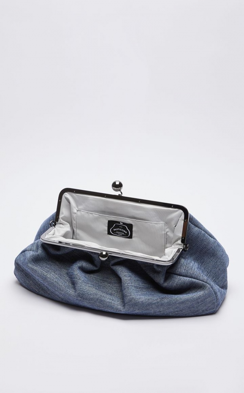 The Pasticcino Bag is the super clutch that adds a touch of personal charm to your everyday style. Pasticcino Large in cotton with denim-effect jacquard finish. The leather shoulder strap, slightly wider and featuring an adjustable buckle, is inspired by classic trench coat belts. Lined interior. Its soft design adapts to the wearer’s silhouette. Finished with resin spheres and a custom label on the inside. Size: 47 x 18 x 27 cm.