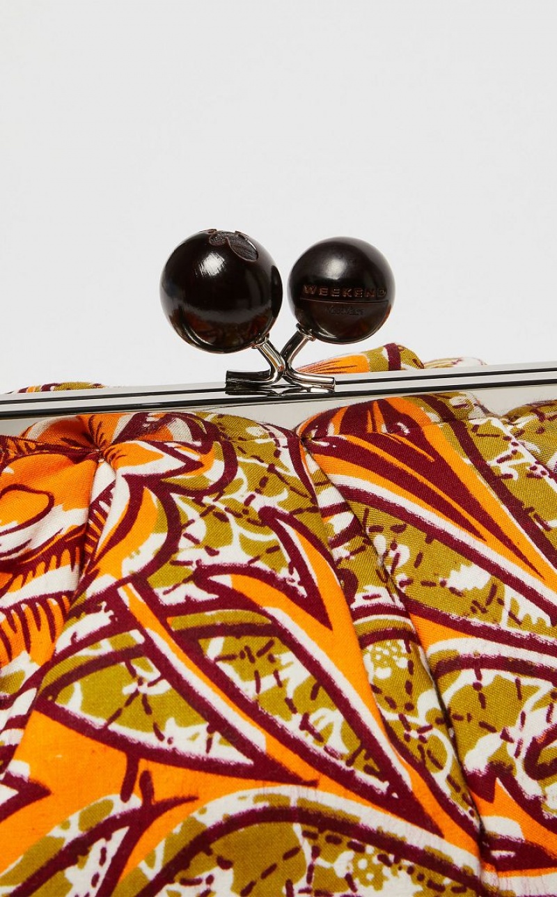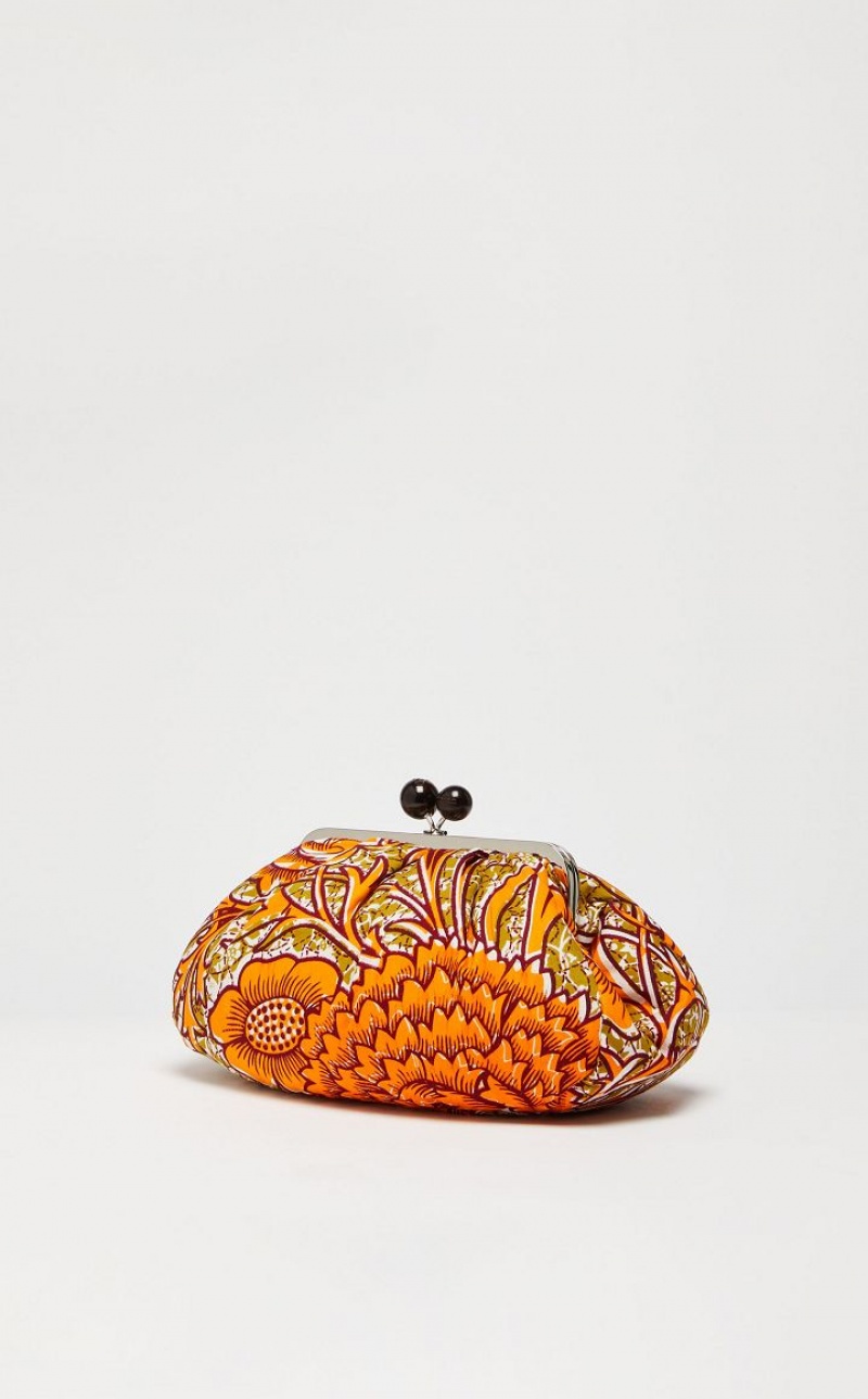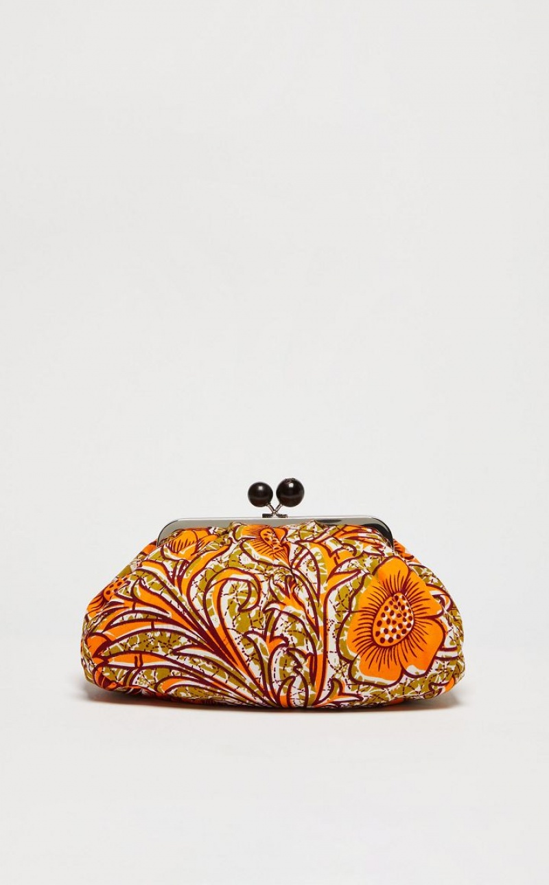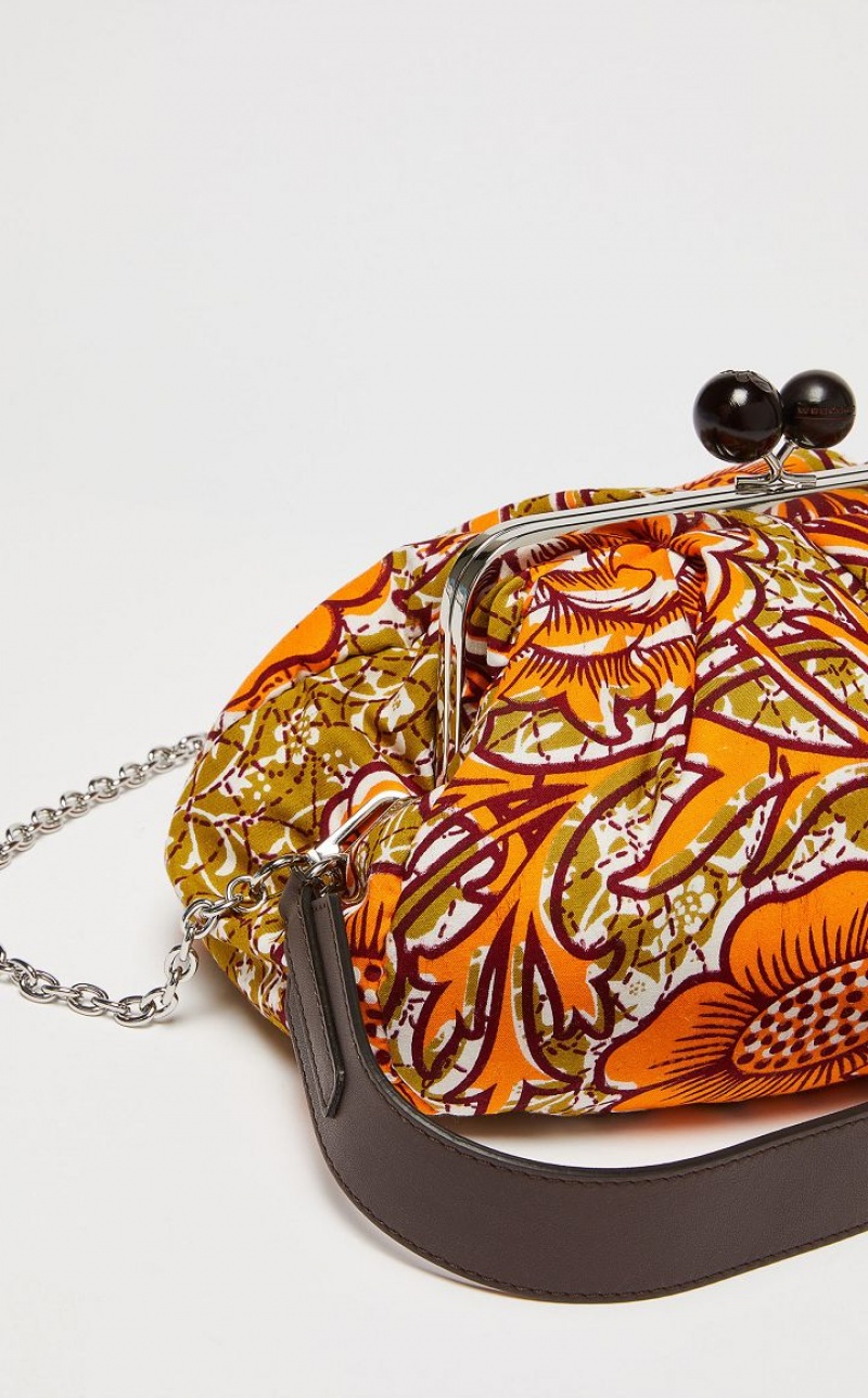 The Pasticcino Bag is the super clutch that adds a touch of personal charm to your everyday style. Medium sized Pasticcino Bag made of cotton canvas and featuring an African Wax print, with padding to make it even softer and comfier and coffee brown leather details. With a double leather and chain shoulder strap, it can be carried on the shoulder or crossbody, for a versatile and trendy look. Finished with ebony effect resin spheres and custom label on the inside. Its deconstructed silhouette and deliberately oversized proportions make it perfect to meet your every need.