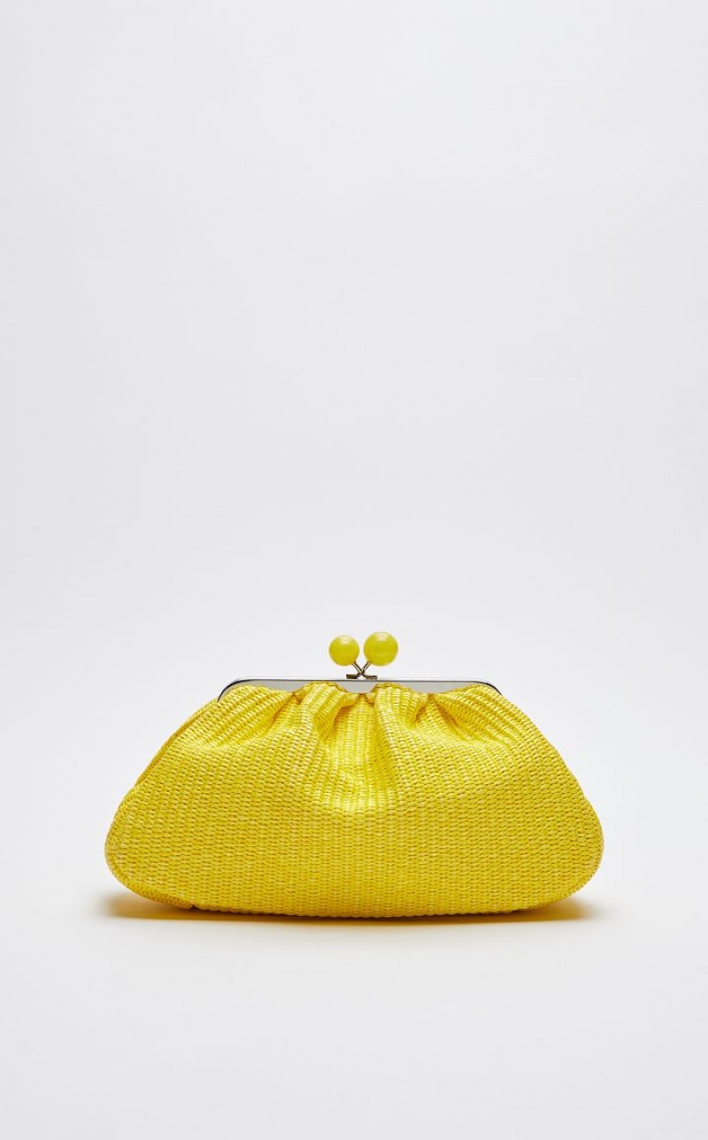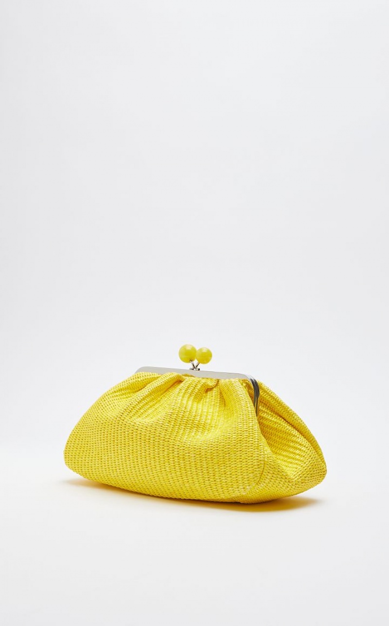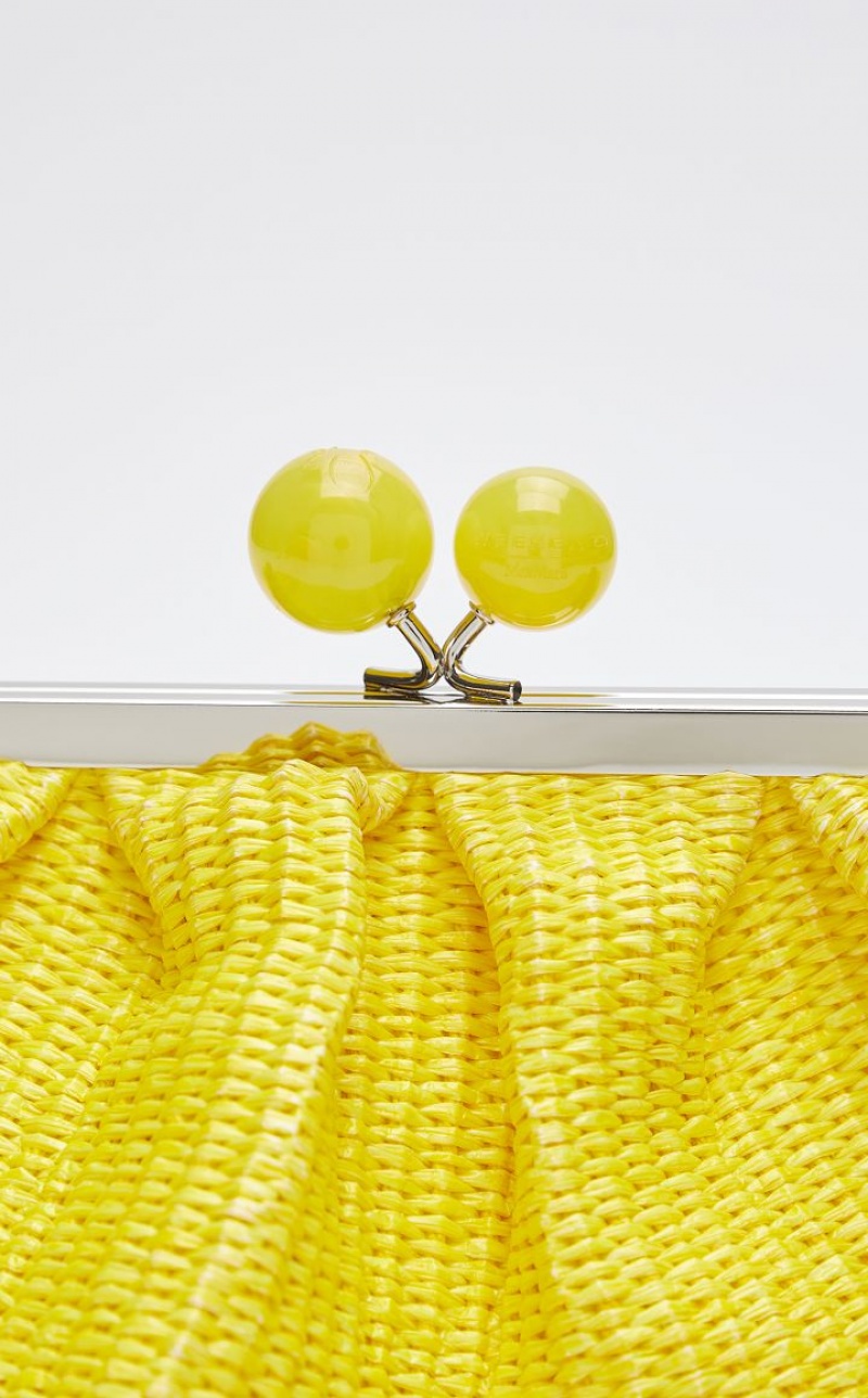 The Pasticcino Bag is the super clutch that adds a touch of personal charm to your everyday style. Medium sized Pasticcino Bag in raffia, finished with handcrafted techniques creating three dimensional colour gradient effects. With a double leather and chain shoulder strap, it can be carried on the shoulder or crossbody, for a versatile and trendy look. Interior lined with striped fabric, featuring an open pocket and custom label. Fastened with a matching opaline resin sphere, with butterfly detail and logo. Its deconstructed silhouette and deliberately oversized proportions make it perfect to meet your every need.
