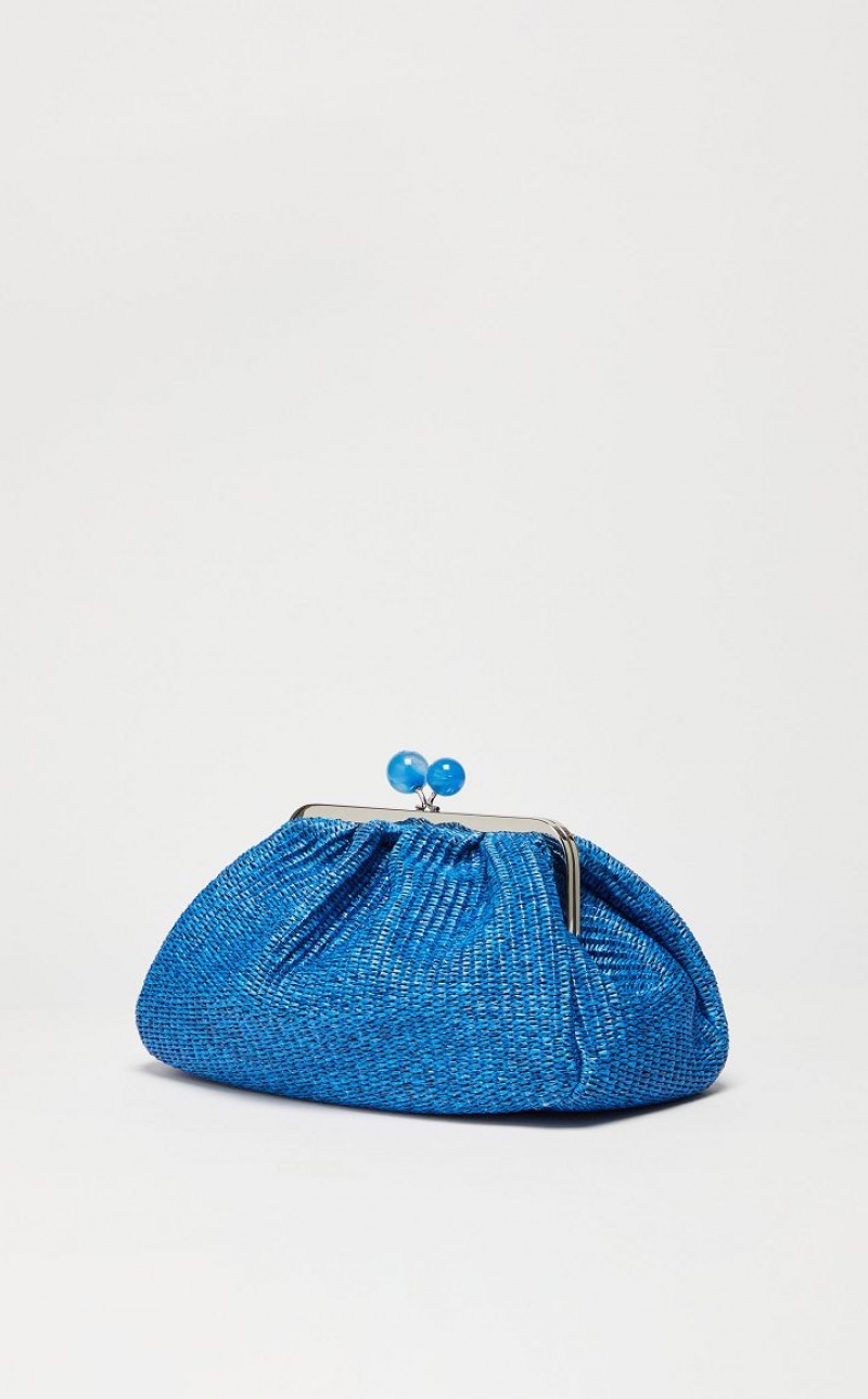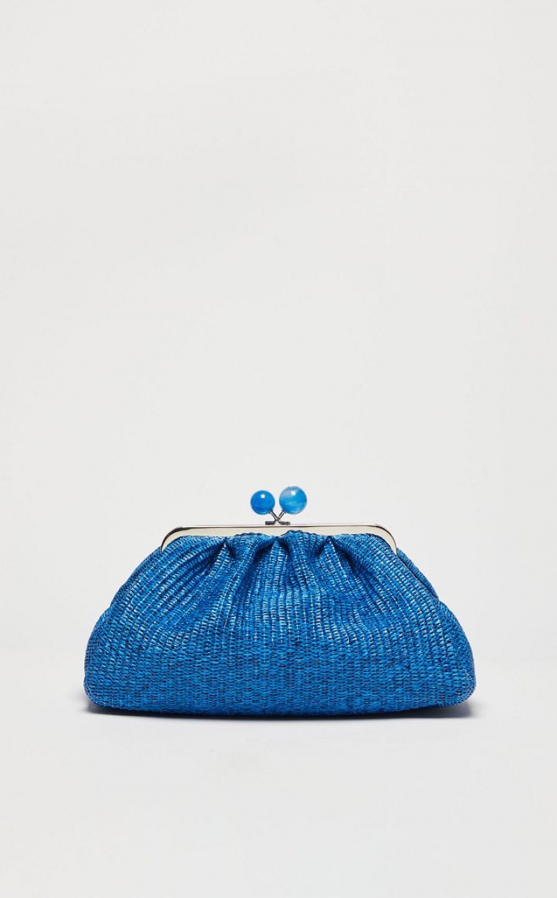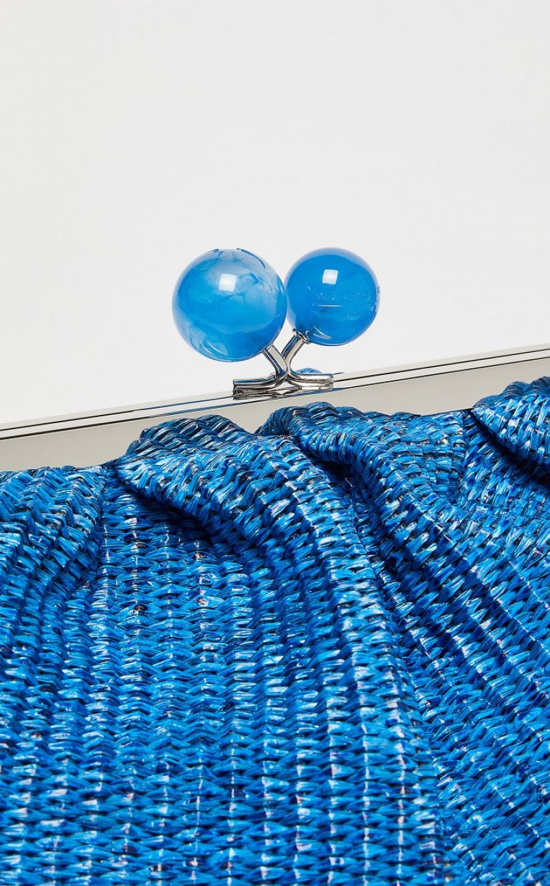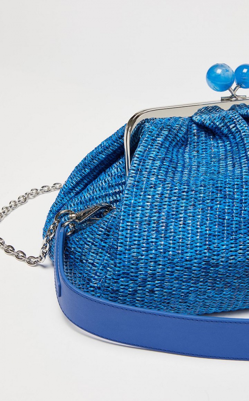 The Pasticcino Bag is the super clutch that adds a touch of personal charm to your everyday style. Medium sized Pasticcino Bag in raffia, finished with handcrafted techniques creating three dimensional colour gradient effects. With a double leather and chain shoulder strap, it can be carried on the shoulder or crossbody, for a versatile and trendy look. Interior lined with striped fabric, featuring an open pocket and custom label. Fastened with a matching opaline resin sphere, with butterfly detail and logo. Its deconstructed silhouette and deliberately oversized proportions make it perfect to meet your every need.