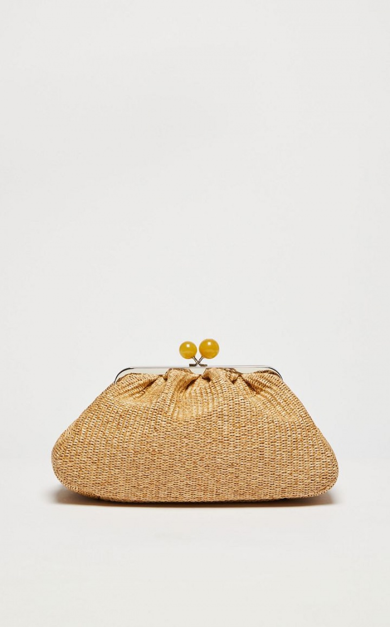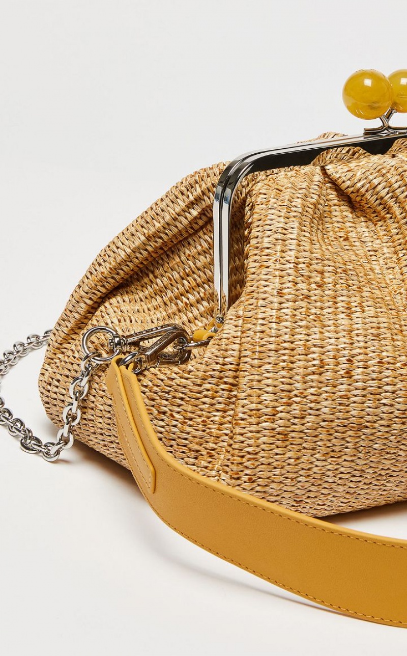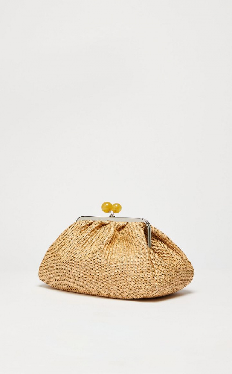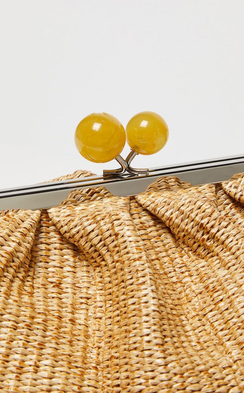 The Pasticcino Bag is the super clutch that adds a touch of personal charm to your everyday style. Medium sized Pasticcino Bag in raffia, finished with handcrafted techniques creating three dimensional colour gradient effects. With a double leather and chain shoulder strap, it can be carried on the shoulder or crossbody, for a versatile and trendy look. Interior lined with striped fabric, featuring an open pocket and custom label. Fastened with a matching opaline resin sphere, with butterfly detail and logo. Its deconstructed silhouette and deliberately oversized proportions make it perfect to meet your every need.