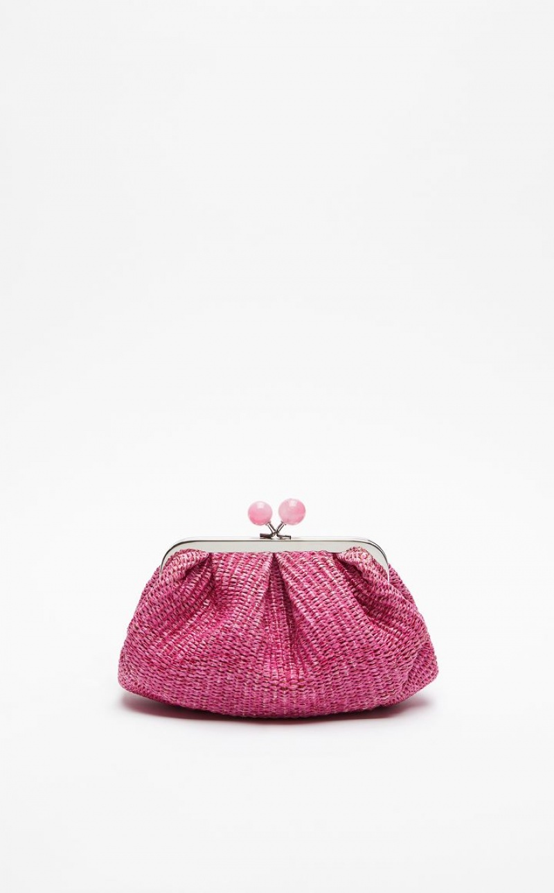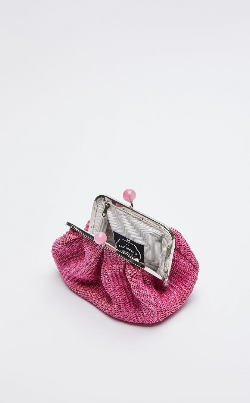 The Small Pasticcino Bag is the super clutch that adds a touch of personal charm to your everyday style. Made of cotton raffia, with lined interior. The detachable chain strap with leather detail makes for a versatile style: wear it as a crossbody or handbag to accessorise an on trend outfit. Finished with resin spheres and custom label on the inside. Its deconstructed silhouette and deliberately oversized proportions make it perfect to meet your every need.
