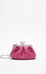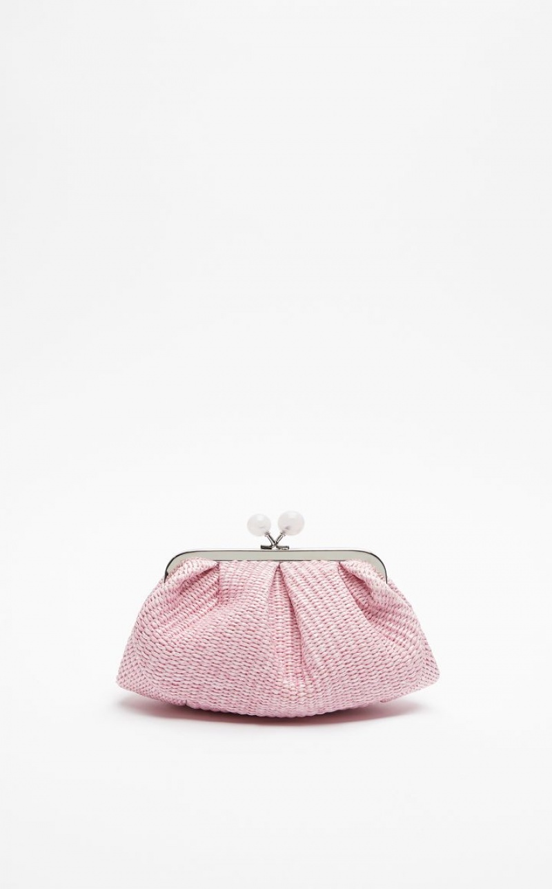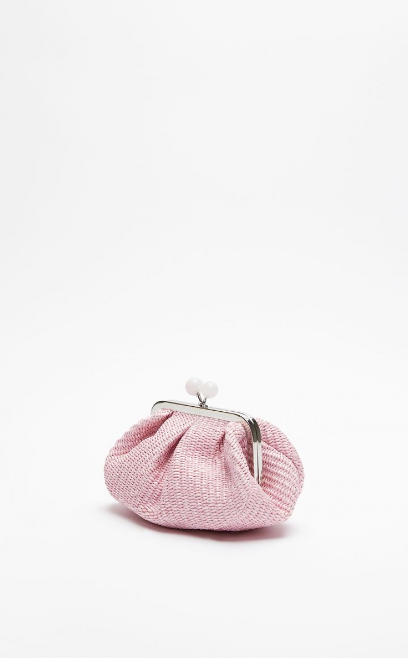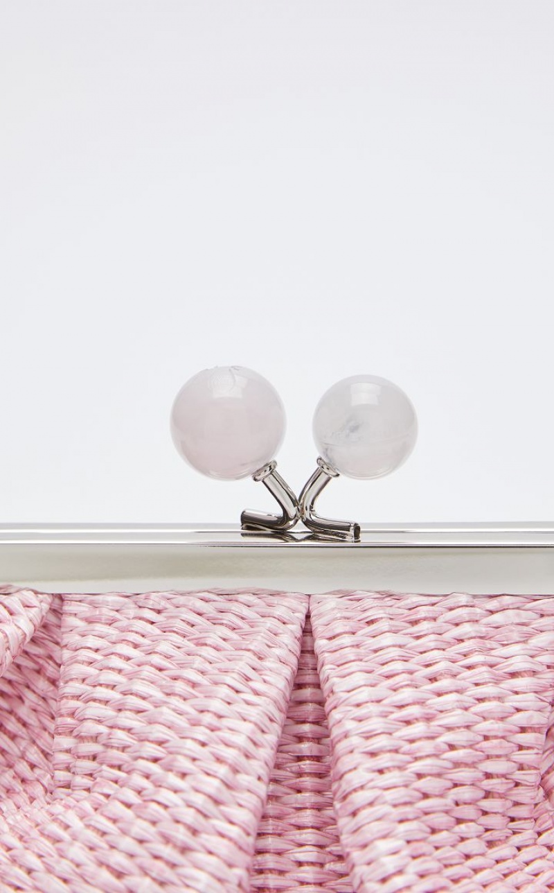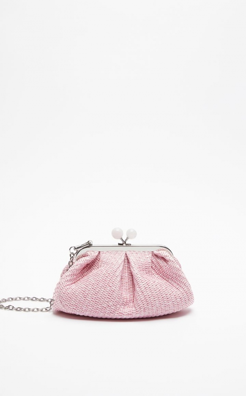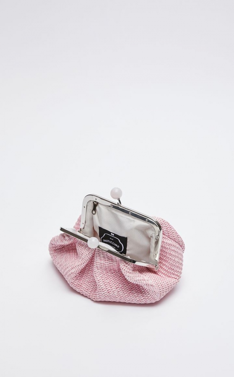 The Small Pasticcino Bag is the super clutch that adds a touch of personal charm to your everyday style. Made of cotton raffia, with lined interior. The detachable chain strap with leather detail makes for a versatile style: wear it as a crossbody or handbag to accessorise an on trend outfit. Finished with resin spheres and custom label on the inside. Its deconstructed silhouette and deliberately oversized proportions make it perfect to meet your every need.