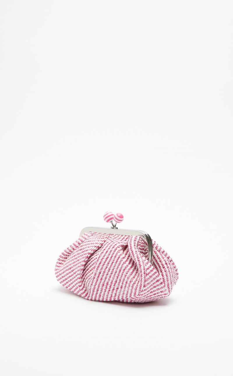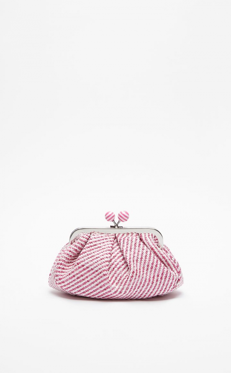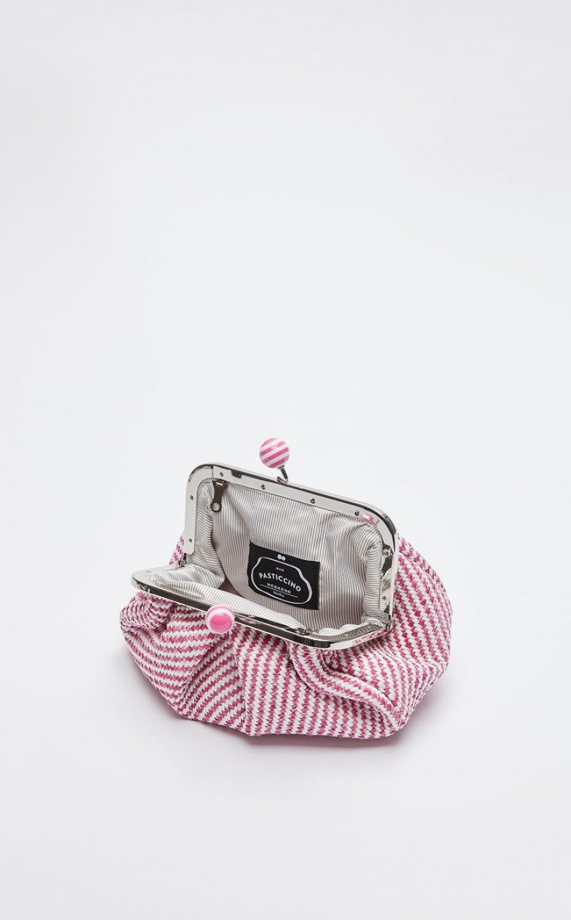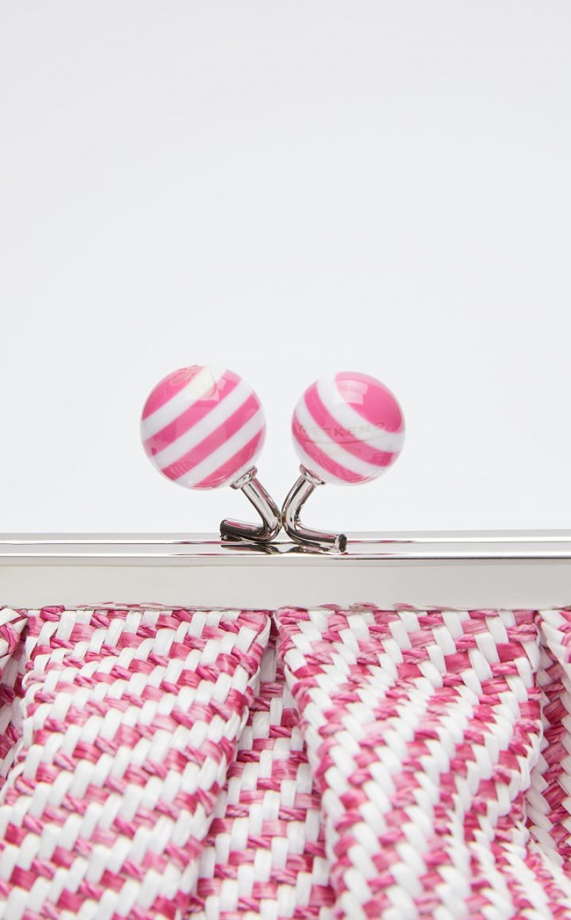 The Small Pasticcino Bag is the super clutch that adds a touch of personal charm to your everyday style. Made of raffia effect fabric, with lined interior. The detachable chain strap with leather detail makes for a versatile style: wear it as a crossbody or handbag to accessorise an on trend outfit. Finished with a matching striped resin sphere and custom label on the inside. Its deconstructed silhouette and deliberately oversized proportions make it perfect to meet your every need.