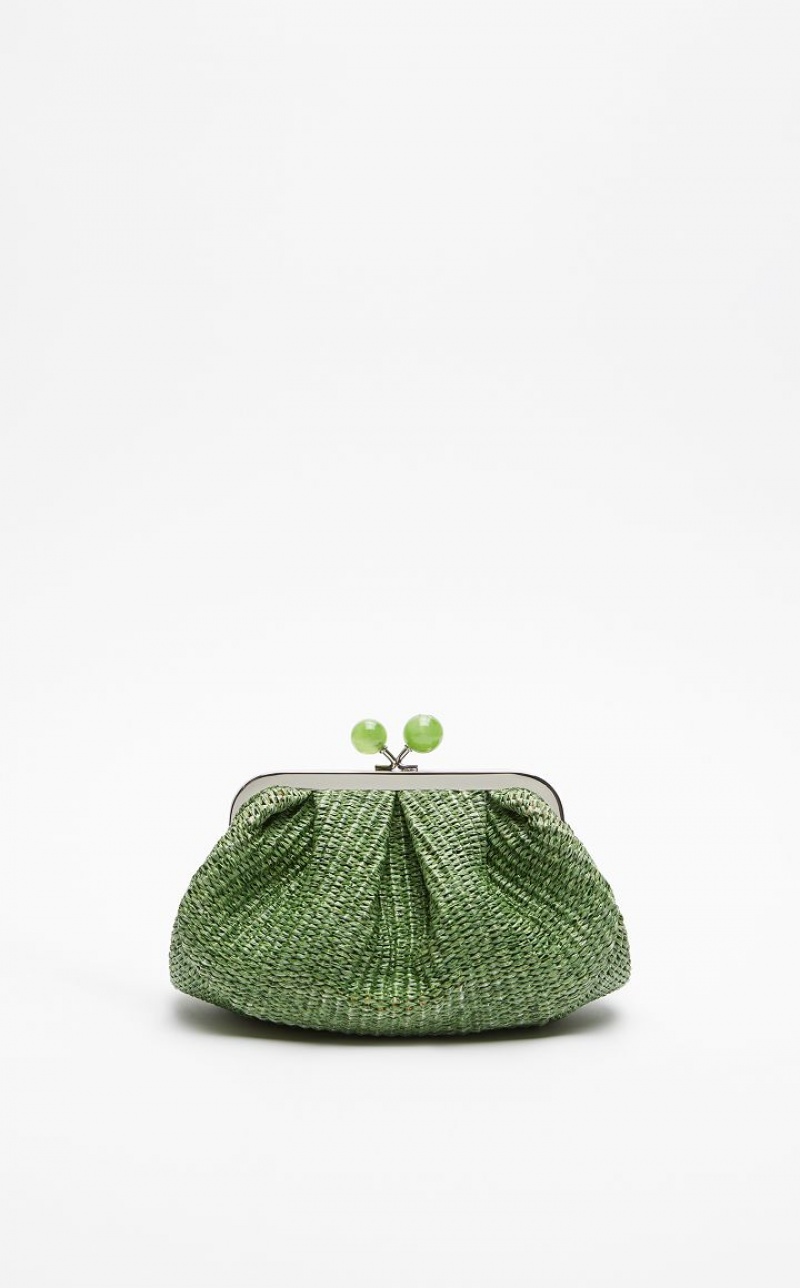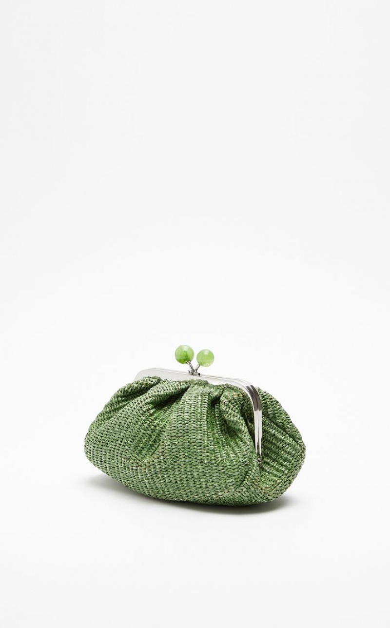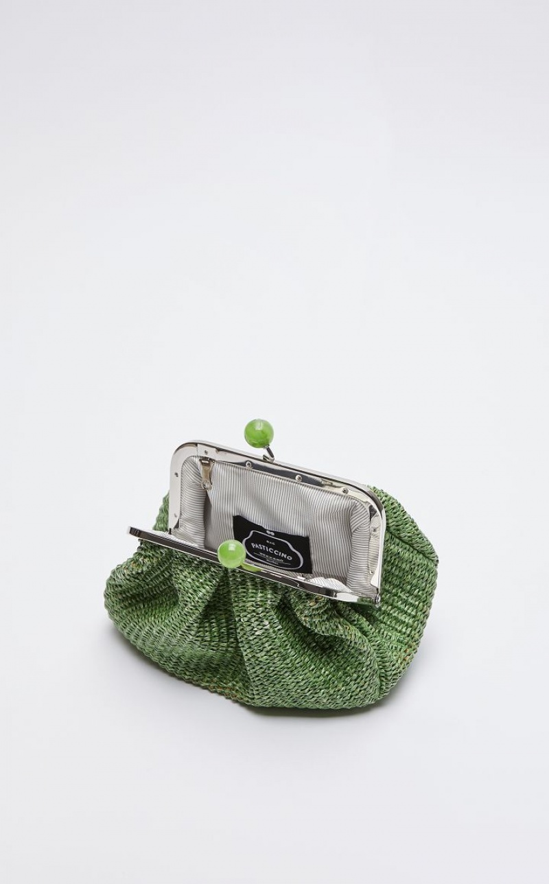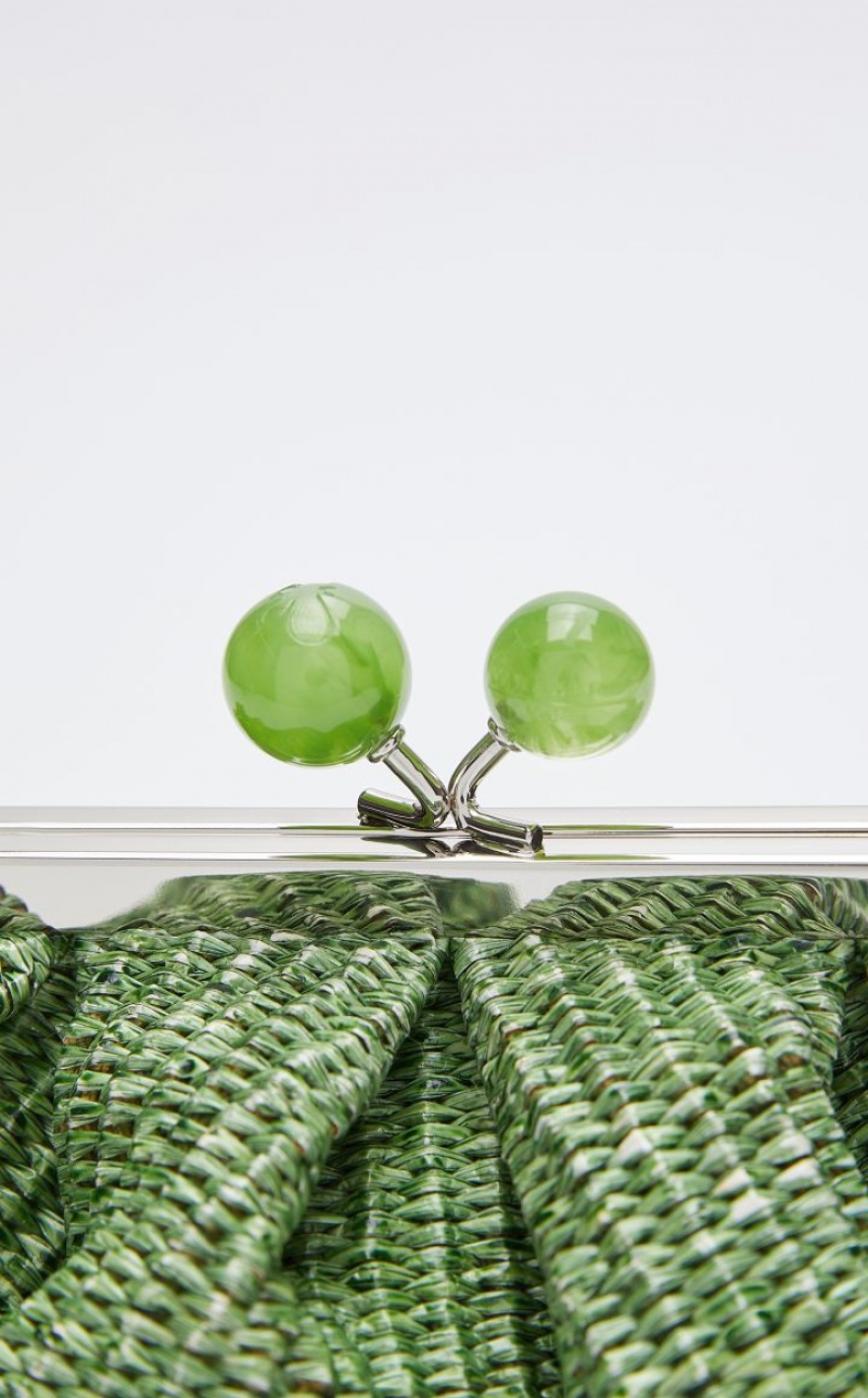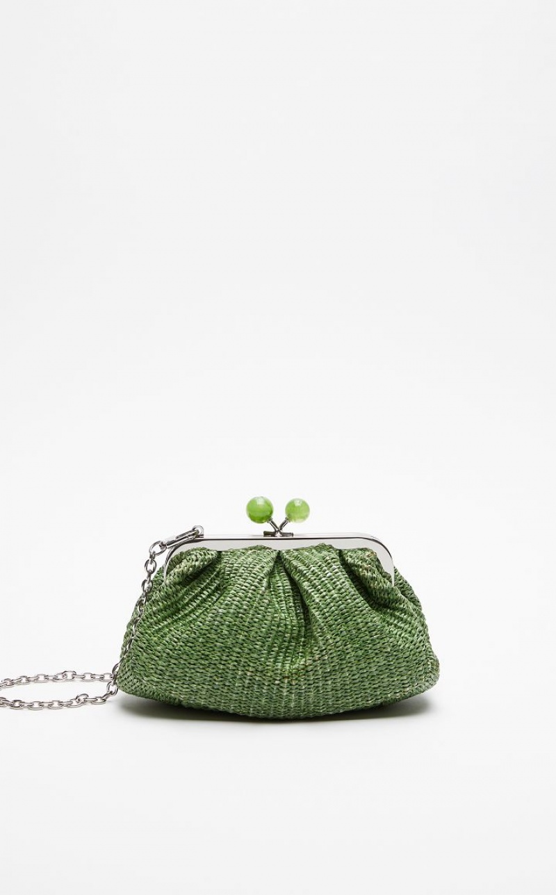 The Small Pasticcino Bag is the super clutch that adds a touch of personal charm to your everyday style. Made of cotton raffia, with lined interior. The detachable chain strap with leather detail makes for a versatile style: wear it as a crossbody or handbag to accessorise an on trend outfit. Finished with resin spheres and custom label on the inside. Its deconstructed silhouette and deliberately oversized proportions make it perfect to meet your every need.